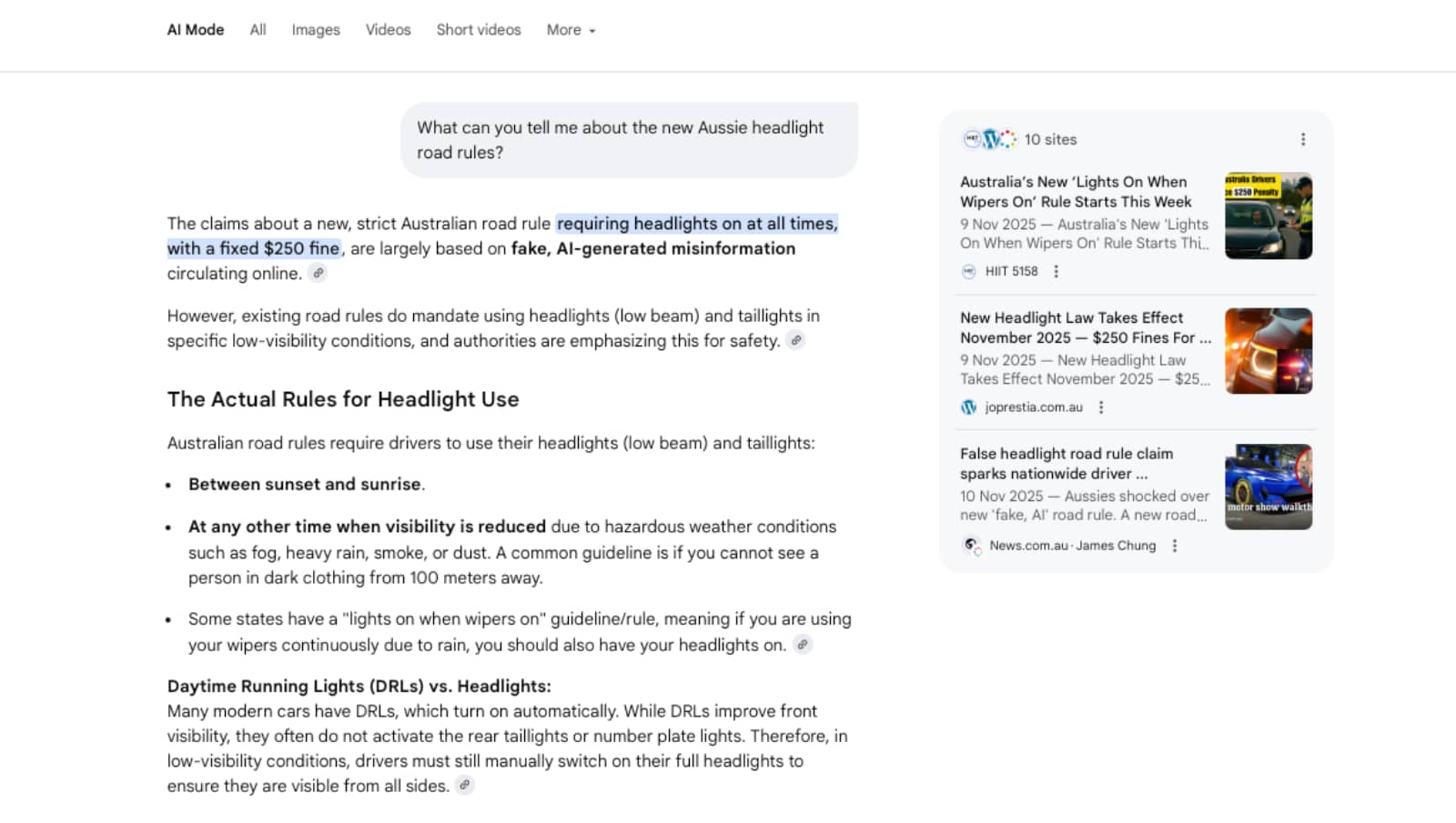 In fairness, Google has had its fair share of problems, but its latest problem was a doozy: the search engine and connected AI Overviews system was summarising misinformation from websites and boosting it as an answer, breaking “news” about a new road rule set to hit Australian drivers requiring everyone to keep their headlights on at all times.