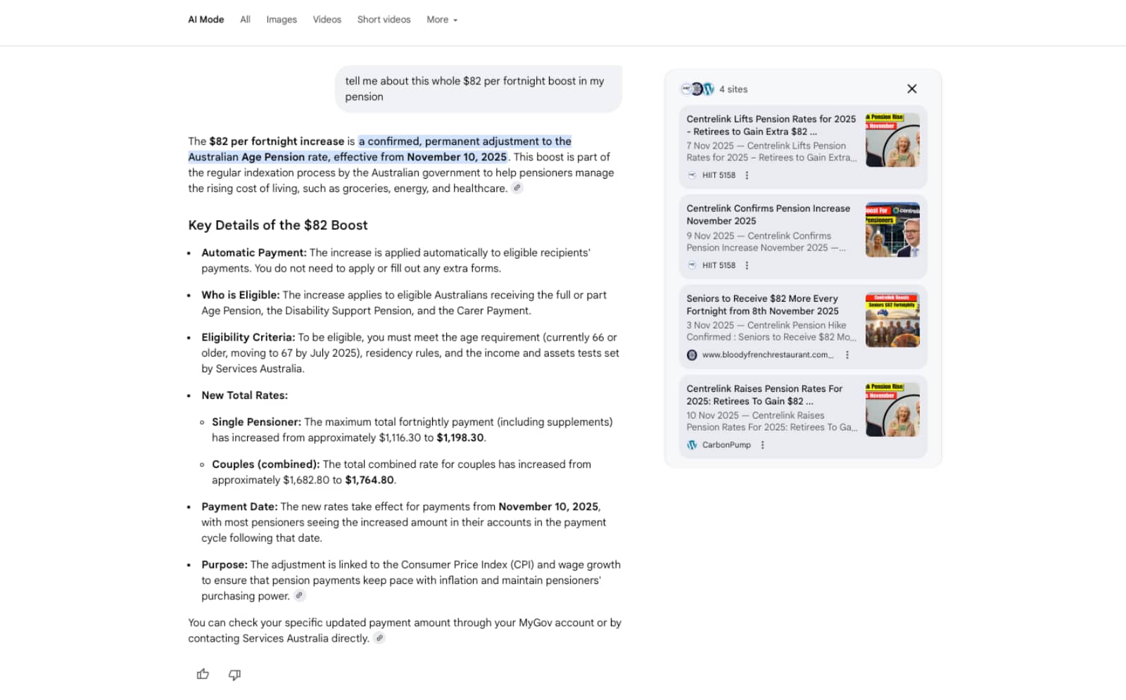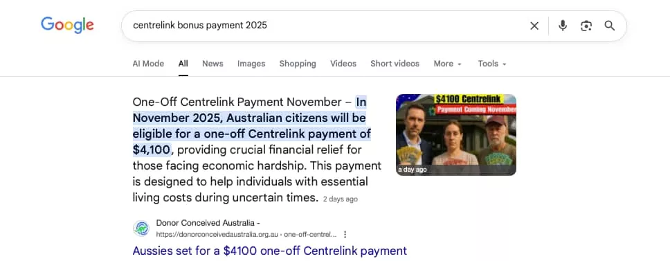 A claim about an upcoming supposed Centrelink $4100 payment was amplified with a featured snippet — not an AI Overview, but still Google’s apparent “best” result — even though Services Australia notes there’s fake information out there.