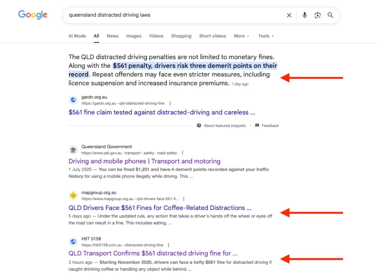 Another claim about a supposed new rule for Queensland drivers getting hit with a fine for holding onto coffee cups when the rule is actually about mobile phones, something Google could confirm directly by showcasing the Queensland Government’s site on the matter.