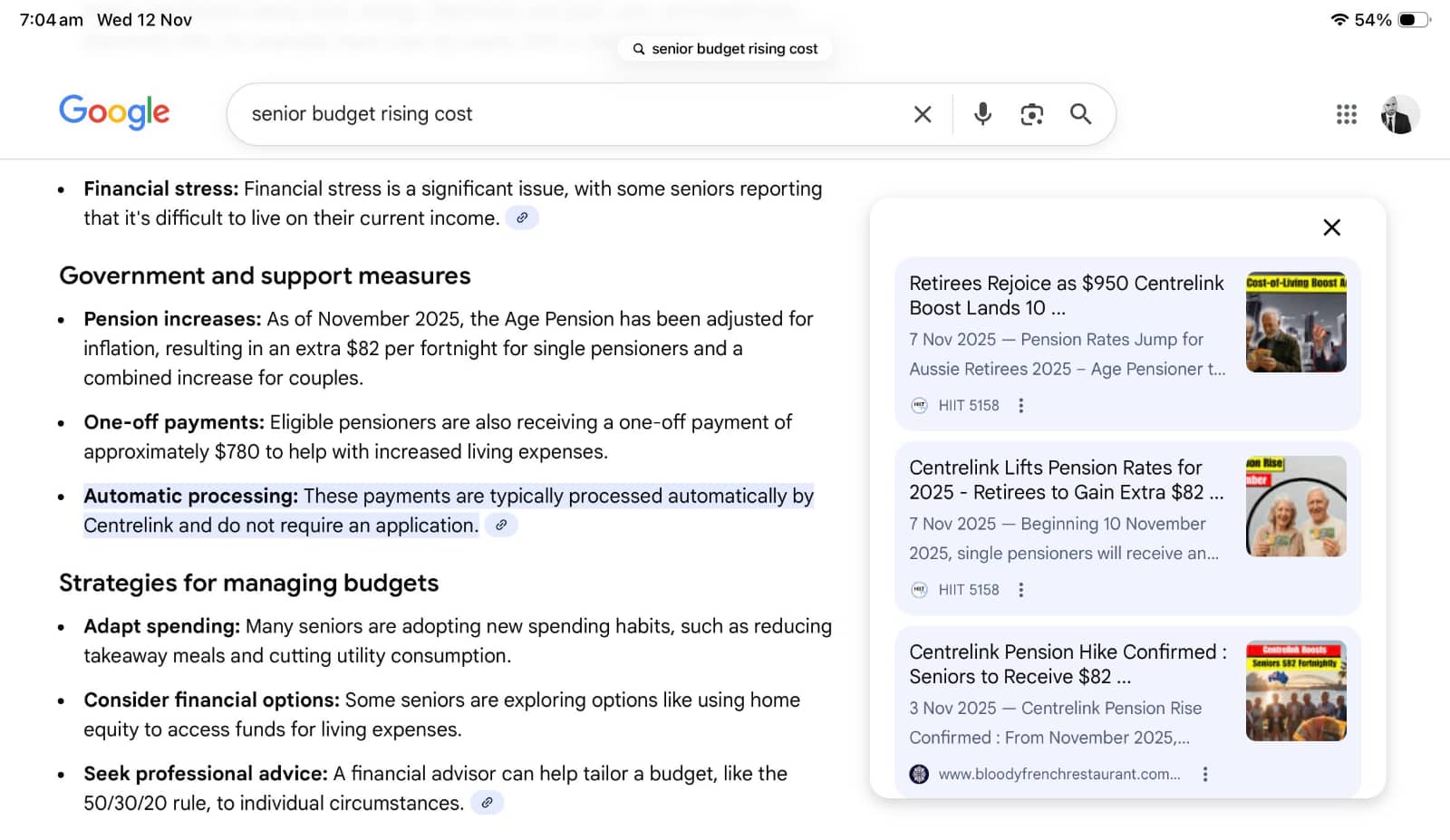 A search for “senior budget rising cost” is one such example, and finds misinformation throughout the AI Overview, with five of the ten results Google showed beneath it coming from these sites.