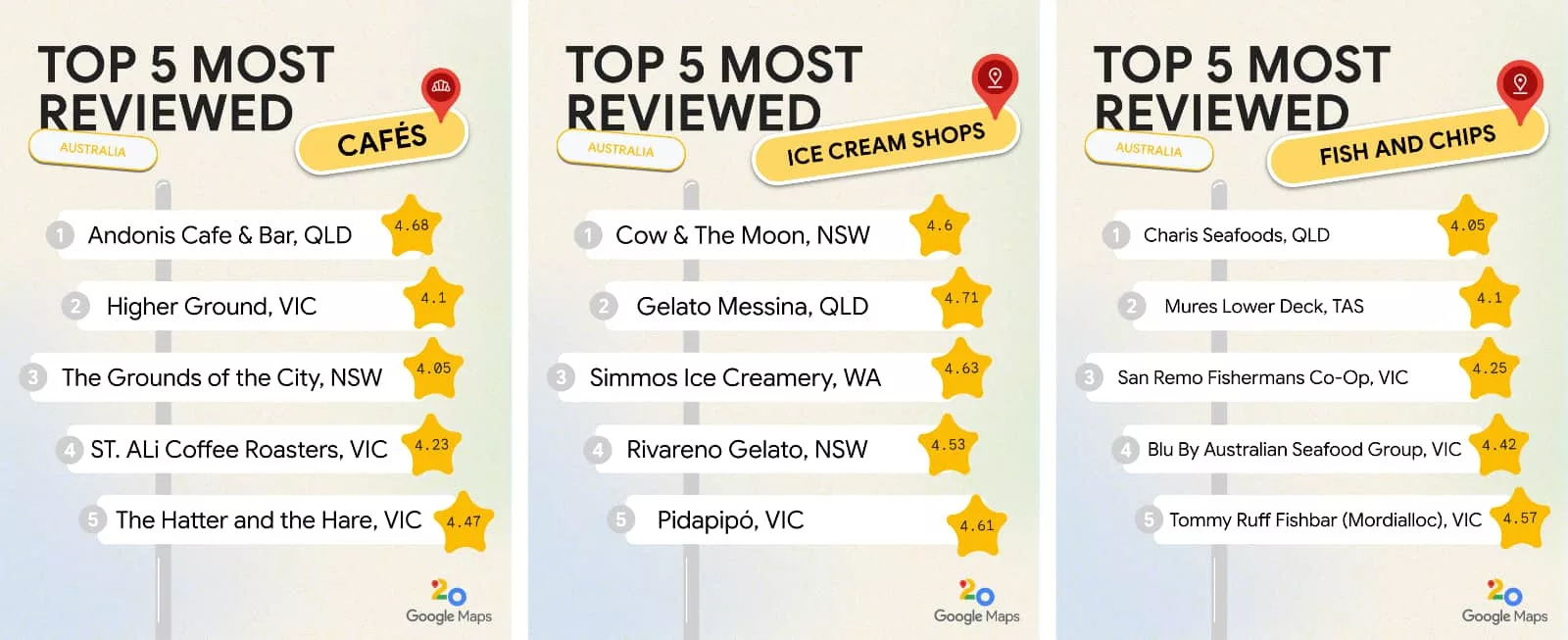 A testament to the power of its users, Google has assembled some of the most famed places in Australia, such as the most reviewed fish and chips shop being Charis Seafoods in Labrador, Queensland, racking up over 5,000 reviews, or the most reviewed Aussie ice cream shop being Cow & The Moon in Enmore, NSW with over 3,000 reviews.