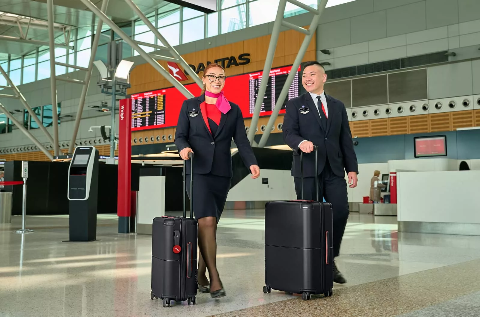 It will be found on two variations of the luggage, one for checking in and one for carrying on, the bags made from polycarbonate with aluminium bumpers and supporting an optional Qantas luggage tag via a holder.