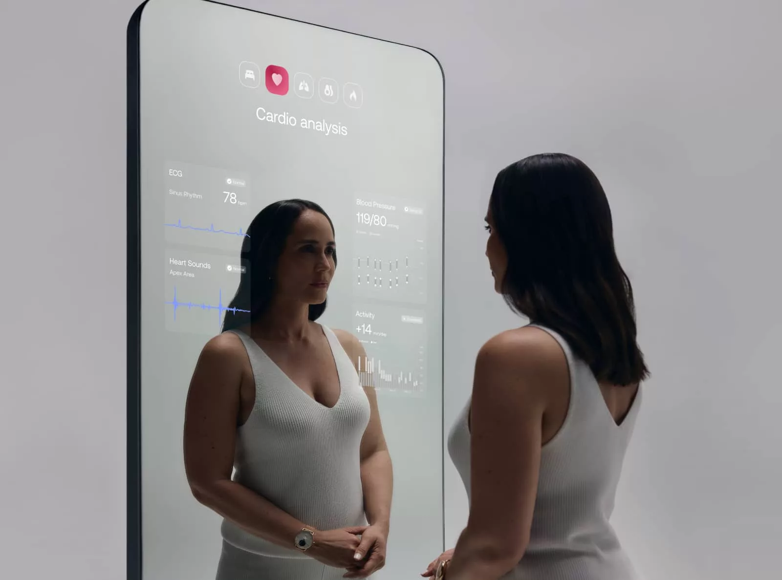 A mirror married to a scale, the technology will offer 360 degree health scans working to deliver a 3D model of your body, complete with sensor readings from a variety of metrics, including weight, heart rate, blood pressure, vascular age, water mass, bone mass, visceral fat, muscle-to-fat ratio, temperature, and electrocardiograph (ECG), features its scales already kind of handle.