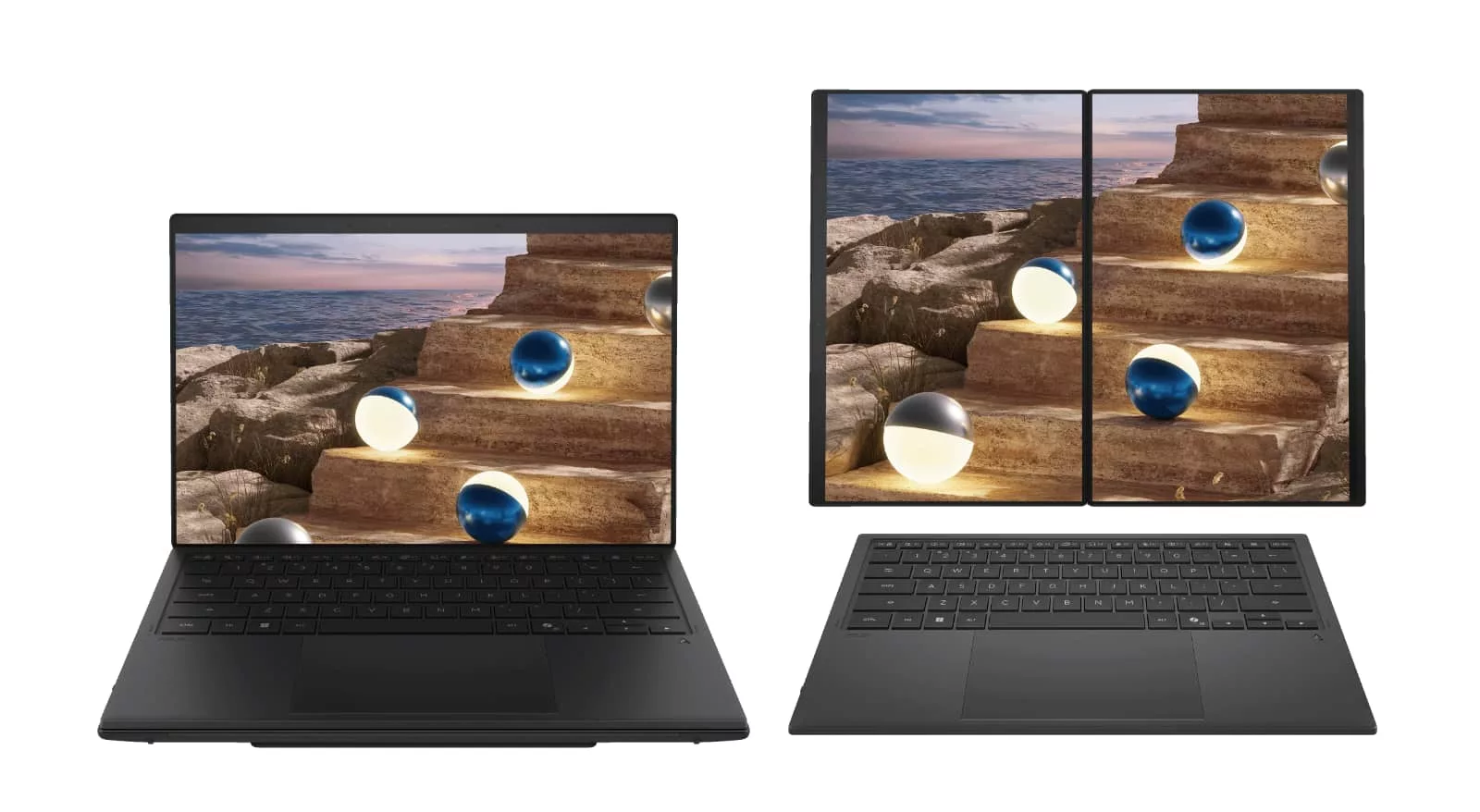 Asus has launched a new incarnation of its “Duo” concept, an idea that uses a two-screened laptop with dual 14 inch OLED touchscreen panels and a wireless keyboard. That combination makes it a 14 inch laptop when used with the keyboard, but if you need a bigger computer, it expands into a larger nearly-20 inch desktop, ideal for when you have the room.