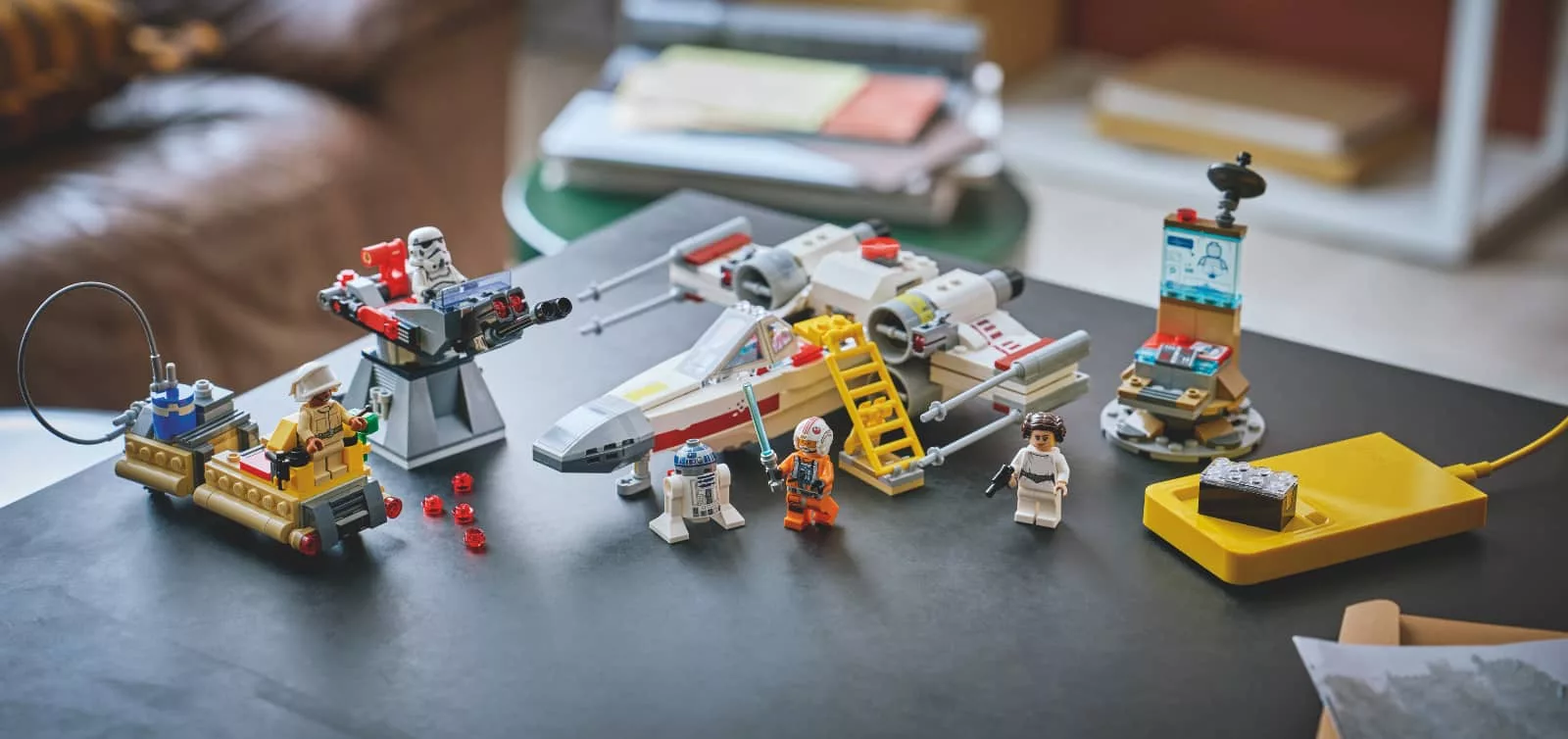 To kick the concept off, there. will be three Star Wars Smart Brick sets covering Luke’s Red Five X-Wing, Darth’s TIE Fighter, and the Throne Room from Return of the Jedi, each of which comes with Smart minifigs, Smart Tags, and the single Smart Brick powering it all, as well as a charger for the brick.