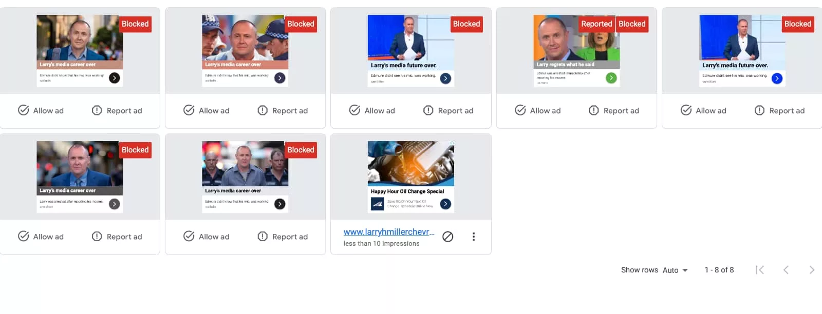 In the Emdur example above, we found the ad in an active state on Meta’s network during the time this story was written, complete with the link to the fake Nine website. Google clearly runs ads for fake Larry, so much that we needed to moderate their appearance on our site, as well. Most of those links go to really unusual international websites, but it doesn’t change the fact that the ads can still be damaging.
