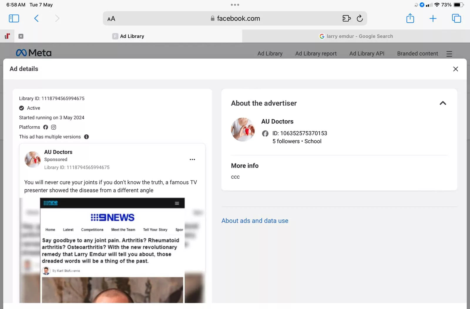 It’s not just a fake Larry you’re seeing on your screen, but a whole raft of people. A fake Richard Wilkins was found in our list of moderated ads on Google’s AdSense, but we also found plenty of Dr. Karl Kruszelnicki ads on Meta, all searchable from Meta’s Ad Library.