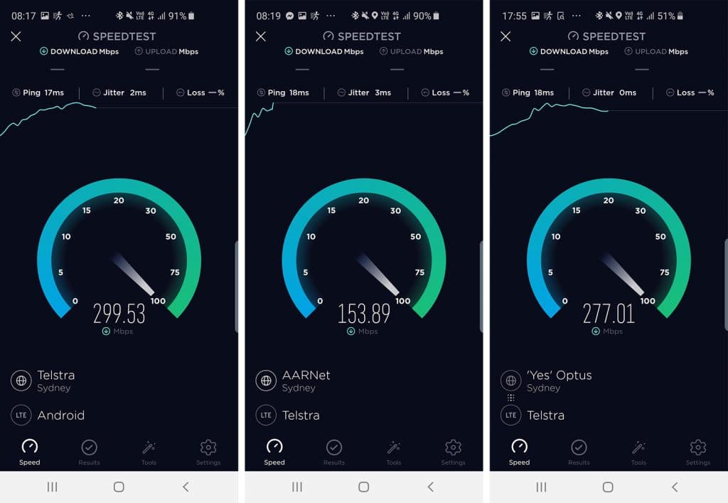 Download speeds were fairly strong, too, topping out at 299Mbps in our tests across the Telstra network in Sydney’s CBD.