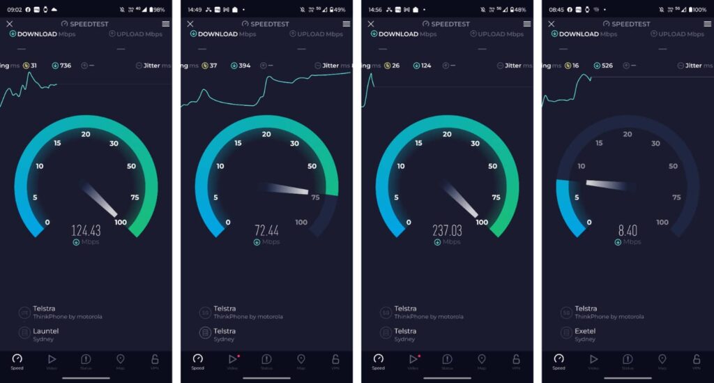 Testing the ThinkPhone on the Telstra 5G network by way of Mate, we found speeds hitting as fast as 248Mbps in our tests.