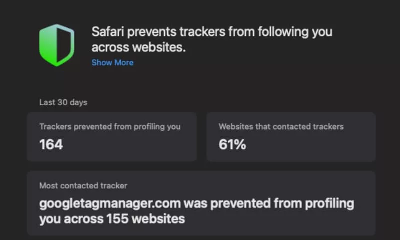 Take how Safari considers things, accessible on macOS when you trigger the “Privacy Report”. This report flat out tells you not just how many trackers were prevented from profiling you or how many websites tried contacting trackers, but also which websites they were and the number of trackers that were on them.