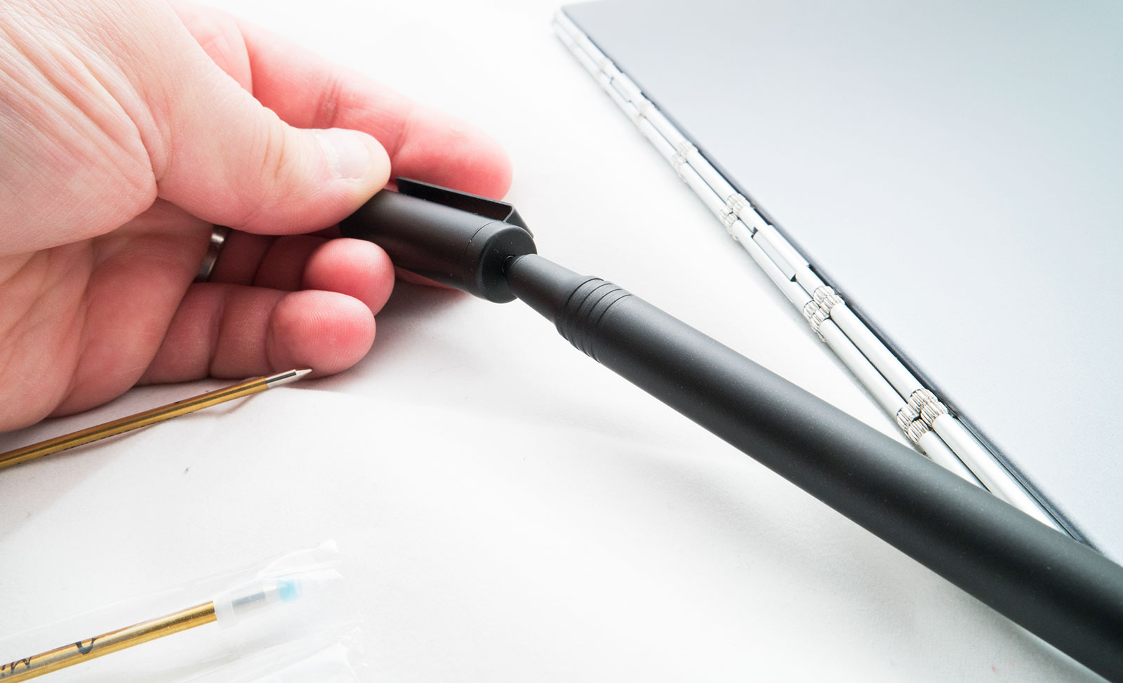 The other option is to replace the stylus tip with a pen tip, which is easy enough to do: just take the cap off the pen, lean the pen tip into the hole at the top of the pen lid, and pull the pen cartridge out. From there, you can replace it with one of the included proper ink pen cartridges, and voilà, your stylus is now a pen.