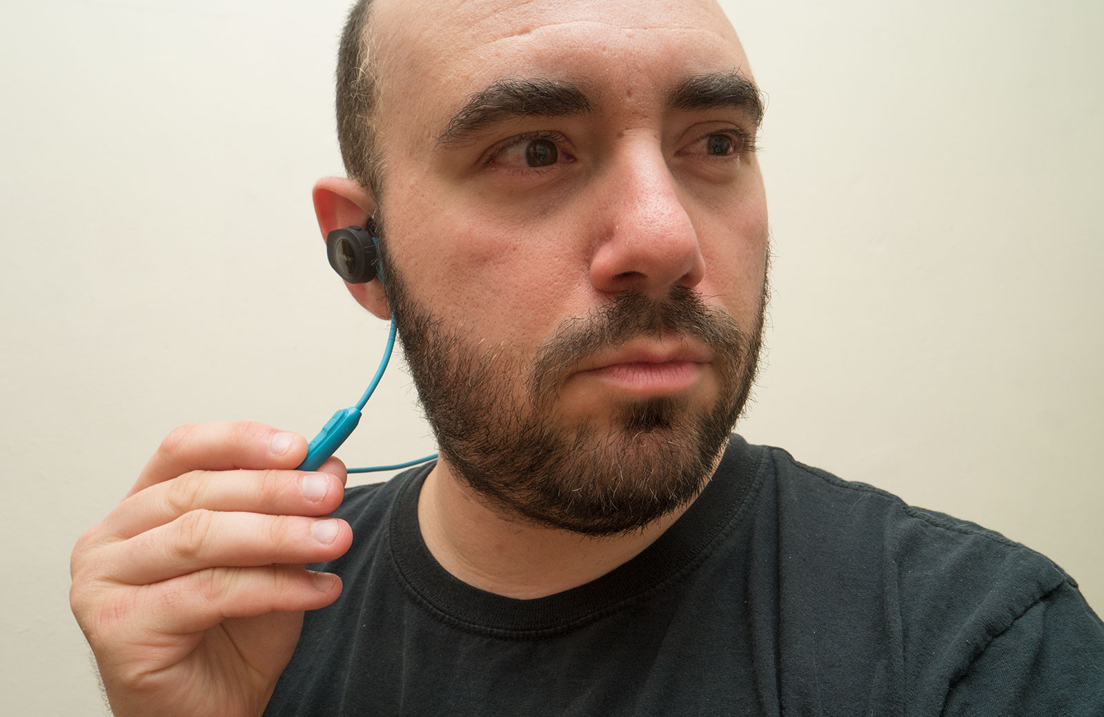 In the SoundSport Wireless, the earwing is back, with an earphone gel sitting inside the ear while the wing part of the earpiece slides into a fold of the ear, suspending the earphone in place.