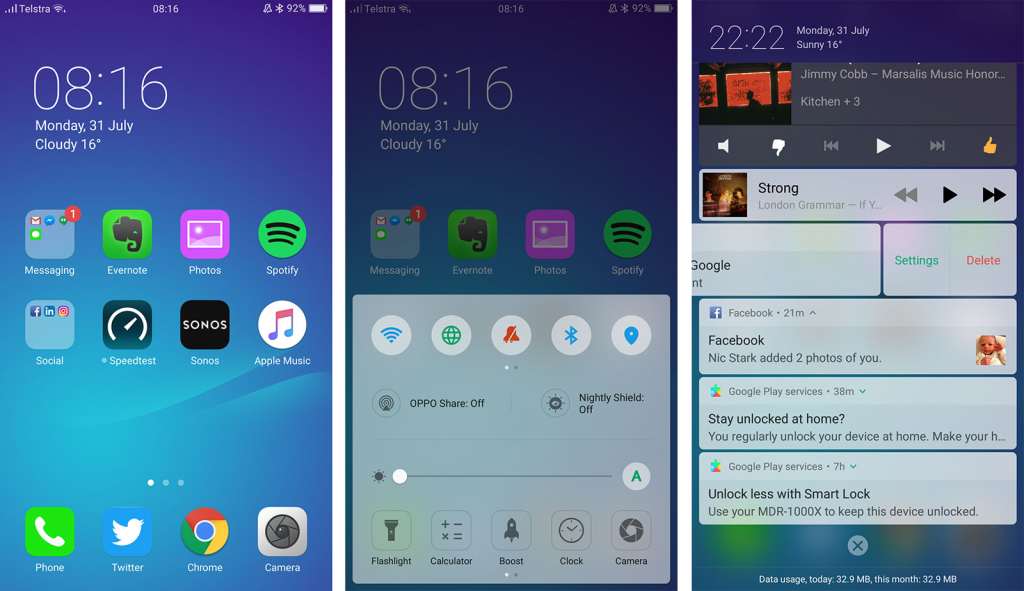 In the latest version, Oppo has pushed it up a notch, with aspects of Android shining through — like support for widgets on the homescreens — but the whole thing coming across like the bride of iOS, because that’s really what it feels like. There’s a dropdown screen at the top for notifications, but now there’s also a very control centre-like section at the bottom for you to swipe up and get.