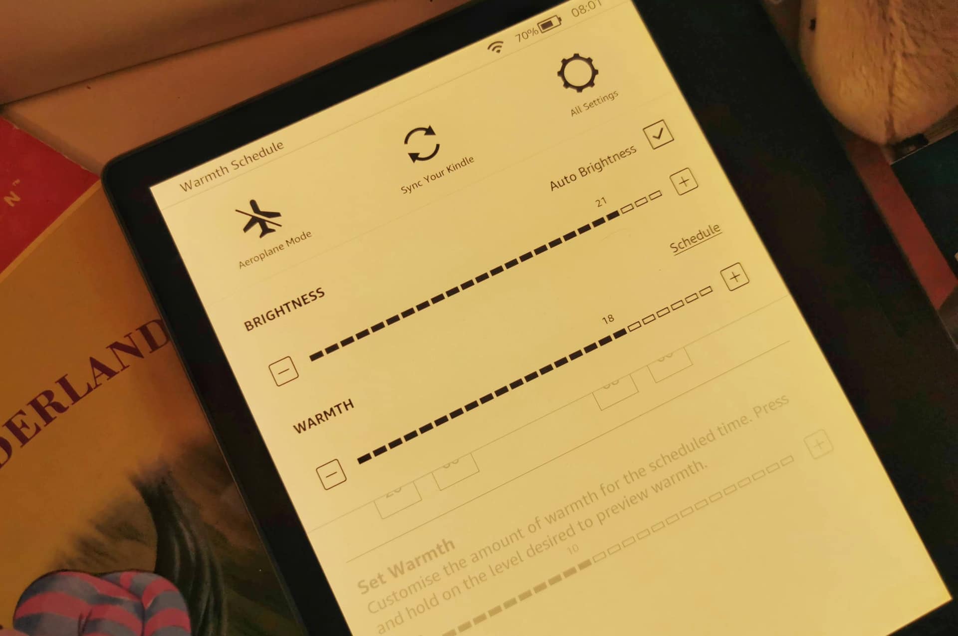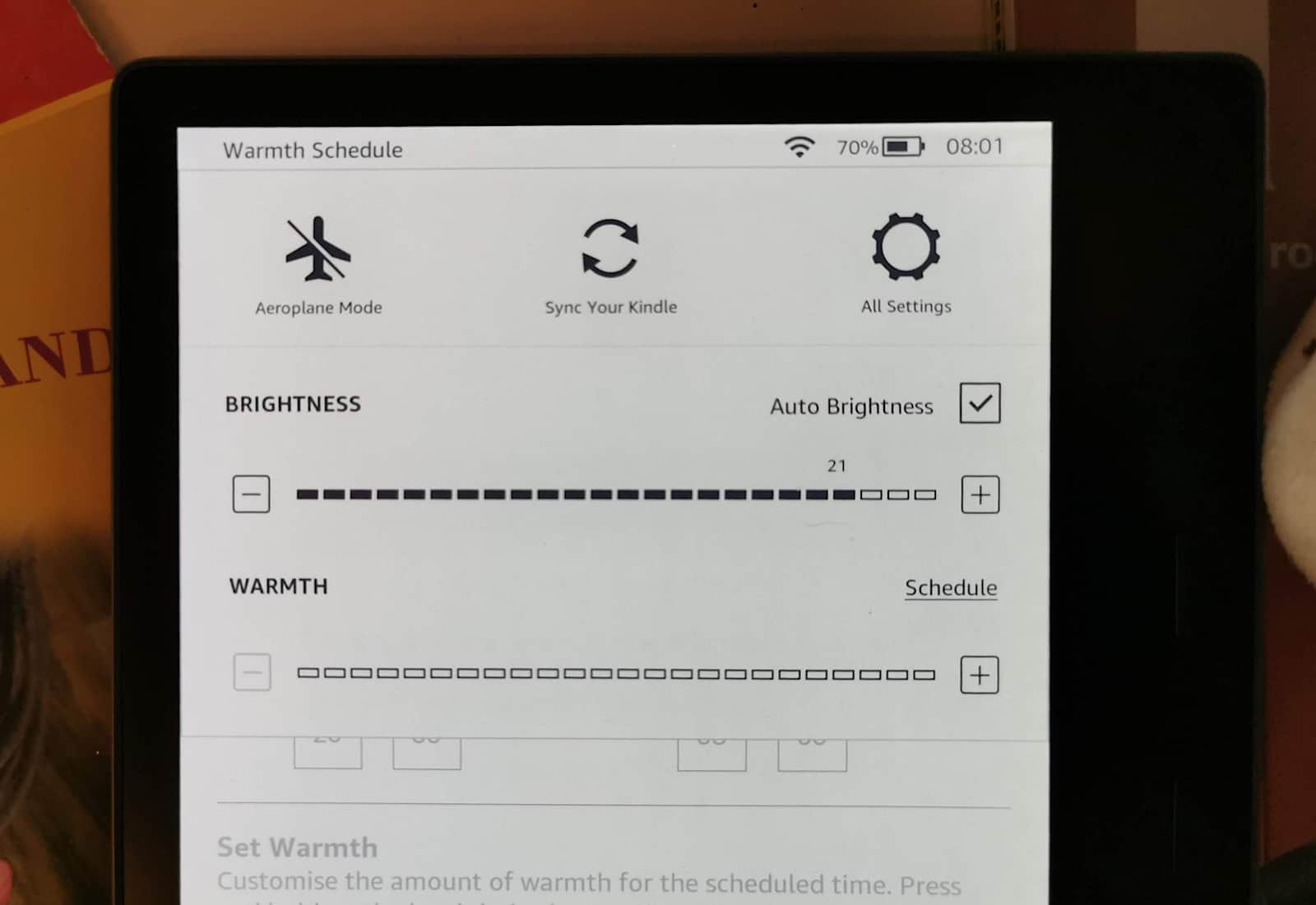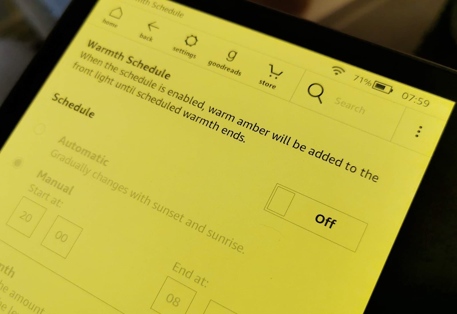 The schedule is easy, and changes the warmth based on times, or sunrise and sunset. Essentially, when you get up and go to bed, the 2019 Kindle Oasis is at its warmest, and as you go through the day, it cools down to a cooler white.