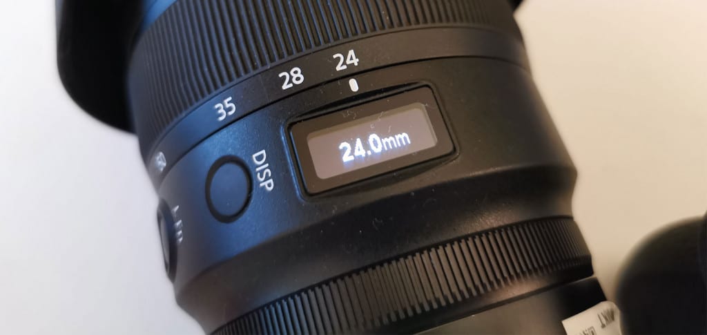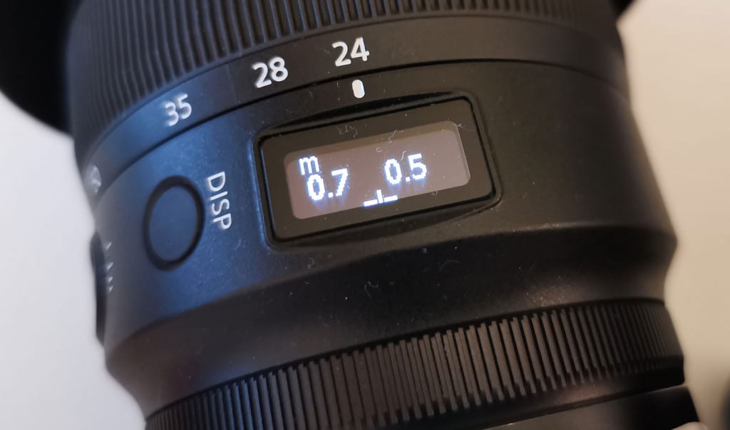 Yes, you read that right: in the Nikkor Z 24-70mm F2.8 S, Nikon has provided a small OLED screen on the lens, replacing the focus range markings with an electronic screen that will not only show your focus distance, but allow you to switch between aperture and focal length simply by pressing the button on the side for “display”.