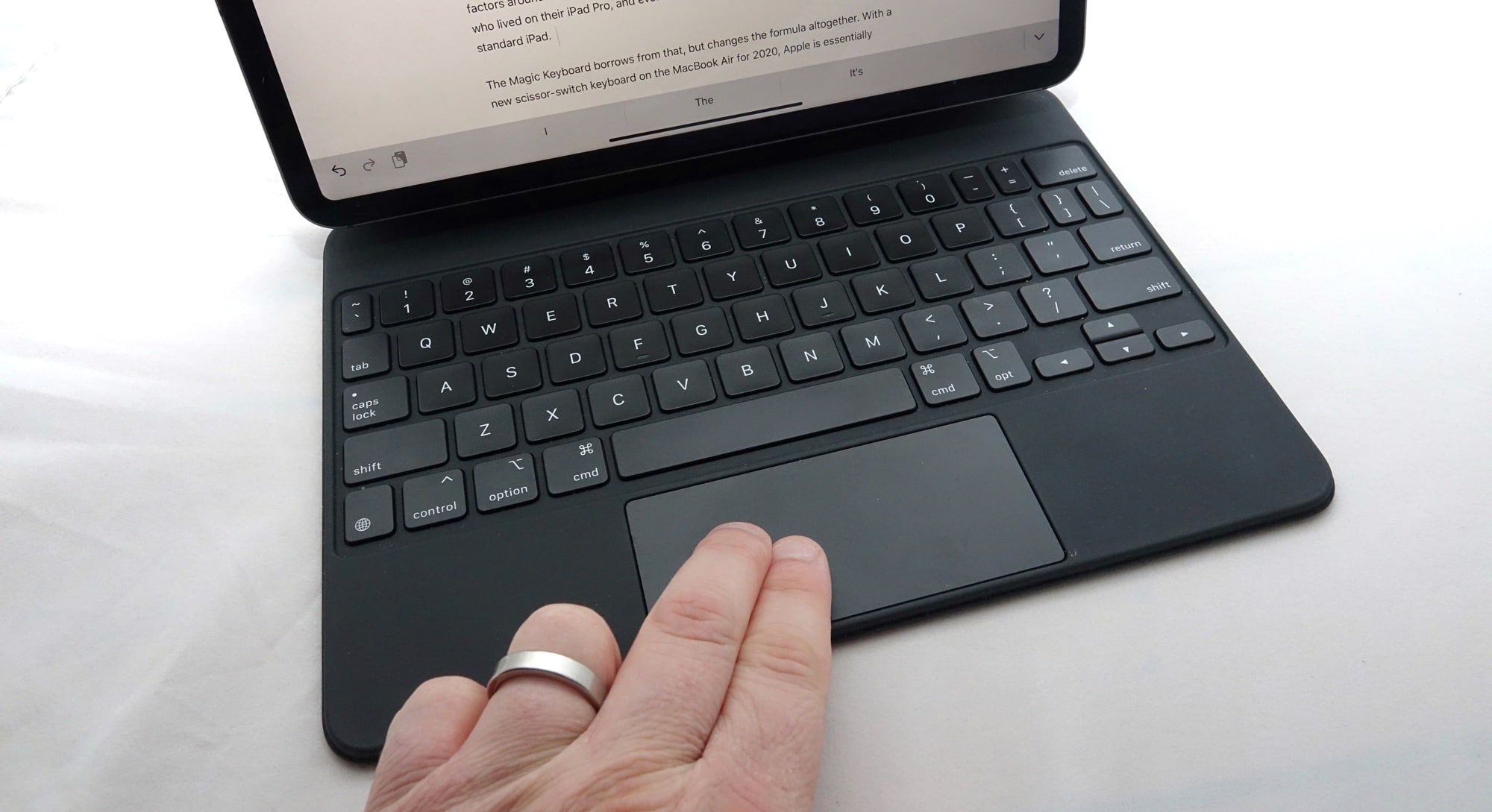 One is the angles, because you can’t easily flatten the iPad Pro in this case like you can the flexible Smart Keyboard. It’s a little thing, and you can always take it out of the case if you want, but while the Smart Keyboard is flexible enough to wrap all the way around the iPad Pro, the Magic Keyboard holds the iPad Pro in place, suspending it above the keyboard. That’s it.