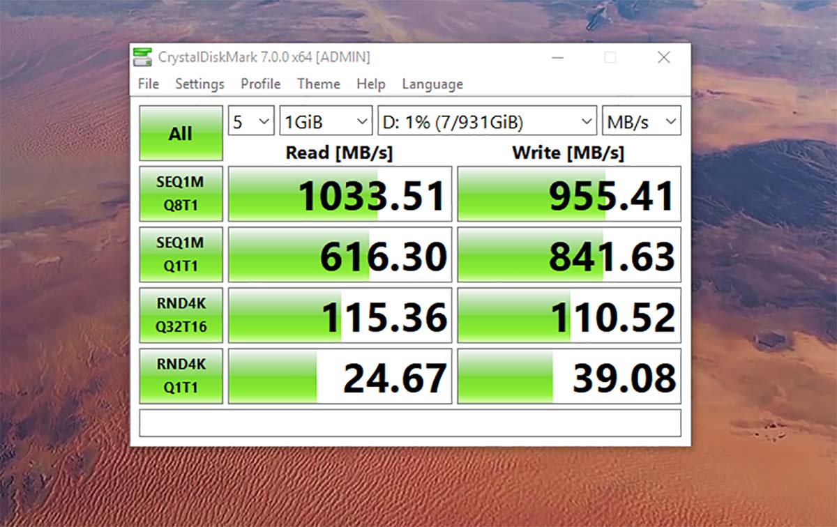 We tried a similar test on Windows PC to see if we could match those specs, and found a better result, with 1033 meg per second on read, but a good 50MB/s below the write. That’s still not bad, though perhaps this is mostly academic, because the speeds are still amazing, just not quite matching what WD says the drive can do.