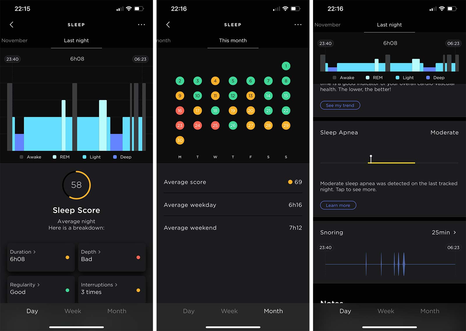 While the Apple Watch can tell you whether you slept, Withings’ metrics go deeper, exploring the depth, the sleeping runtime, the interruptions, your consistency and regularity in going to bed, how long it took you to go to sleep and to get up, and then other metrics such as your average heart rate throughout the night and the times you snored. It’s a metric that can form a grade and offer you tips, all coming together in a daily, weekly, and monthly look at your sleeping patterns. You can even export it to share it with a doctor.