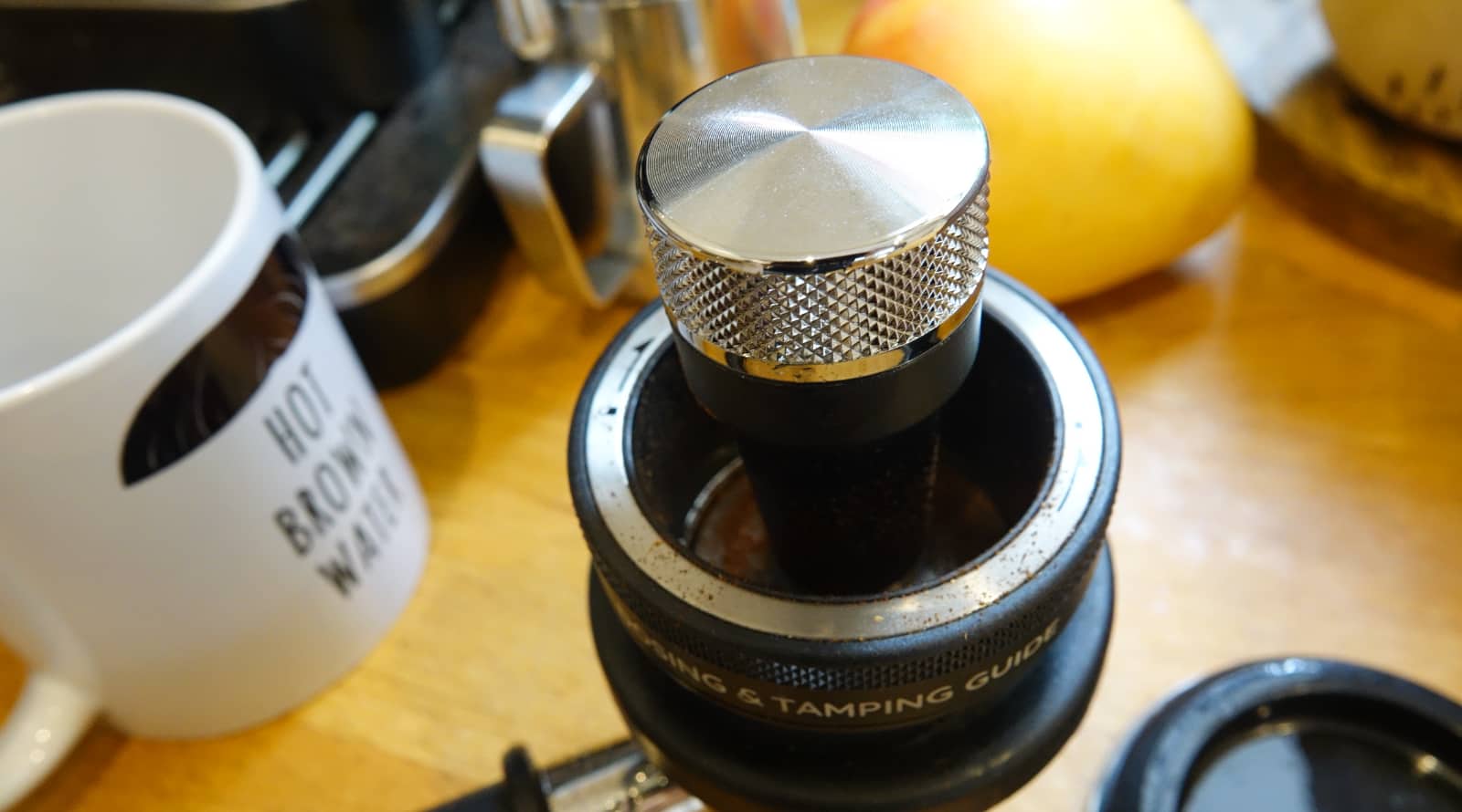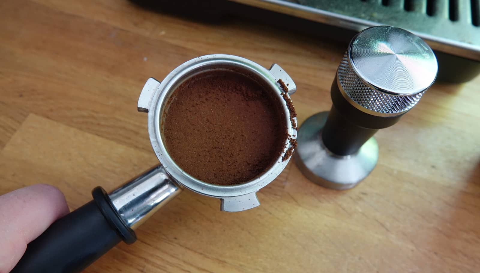 Take it out and tamp those beans down, and you can remove both, giving you a perfectly flat and compacted head of coffee, ready to be screwed in place for the grouphead.