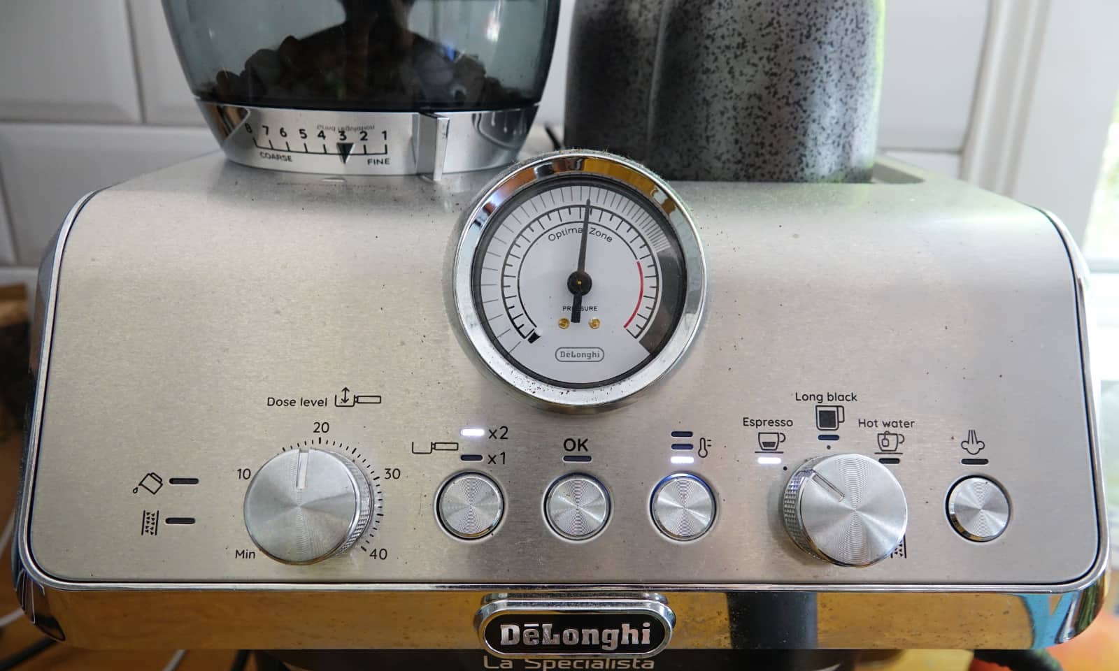 Heaven forbid you want a little more coffee pumped out of the ground and tamped grounds you feed for an espresso, because to do that, you’ll need to turn up the dosage from “one” to “two”. Doing so before you grind will up the dosage of the bean, so if you want 60mls worth of a standard 30ml espresso, but you only have one cup of coffee in the portafilter, you need to either hit that “Ok” button twice on the espresso setting to pump water through it or dial in the setting to two cups after you’ve ground the machine. That’s a lungo, the longer espresso.