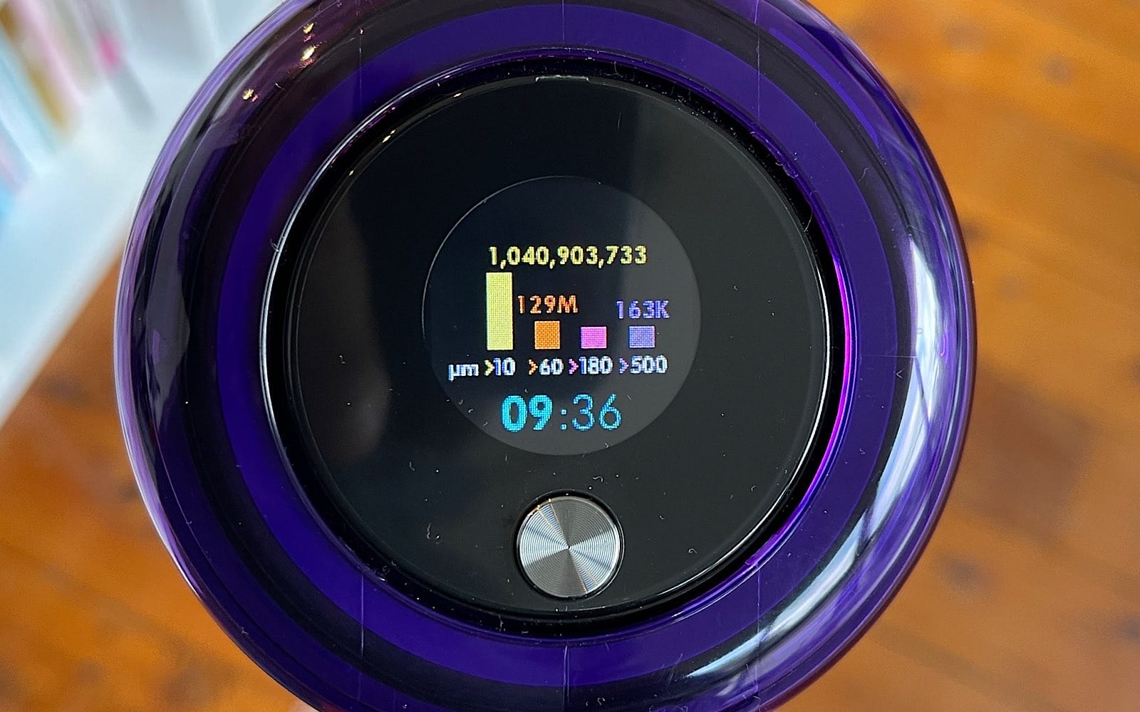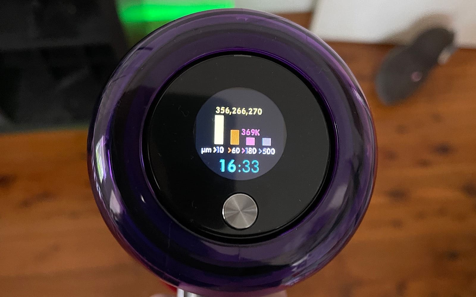 Because yes, there’s a display at the back, and one that shows just how many particles you’re sucking up. In short, it’s going to tell you how many particles you’re picking up and of what size, showing you how much you’ve captured measuring to the smallest of microns up to the big ones.