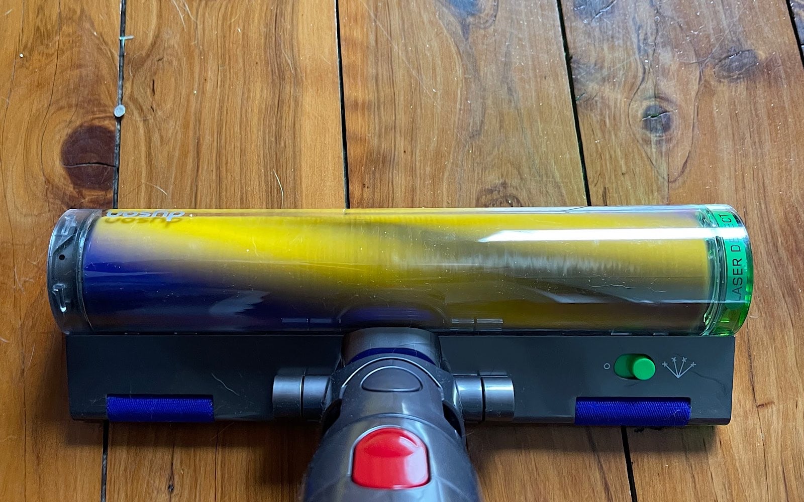 On the outside, Dyson includes a green laser mounted to the side of the Slim Fluffy cleaner head, which can be switched on and off. When switched on, however, the green laser lights up a part of the floor at a 1.5 degree angle in front of the vacuum so you can see all the dust and particles you need to run the fluffy head over.