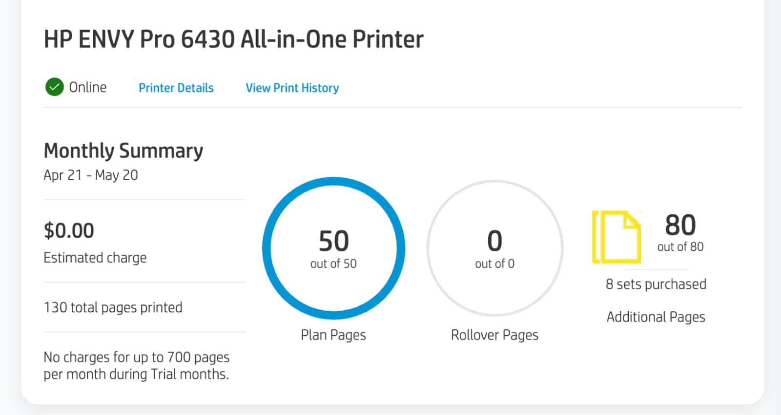 The service also gives you a web dashboard to work from, mostly to see how your page economy is going for you, and it’s here you might find some nuggets. For instance, in our time with Instant Ink, we found we had printed more than expected, thanks in part to double-sided prints acting as two prints on one page, and not the one. It meant we churned through our expected 50 pages per month faster than anticipated, which is good given we had a two month trial to work with.