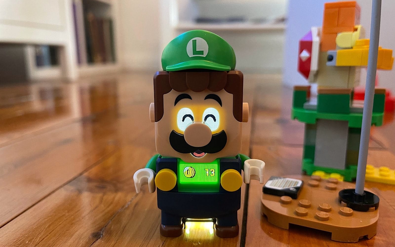 Without the app, Lego Mario is still fun, and begins with holding either Mario or Luigi over an assembled green pipe (because of course it does), which starts a 60 second timer for you to have him run and jump over characters, bouncing them, getting more coins, and seeing what you can amass. It’s basically your own personal physical speed run with a digital toy, which does some neat things altogether.