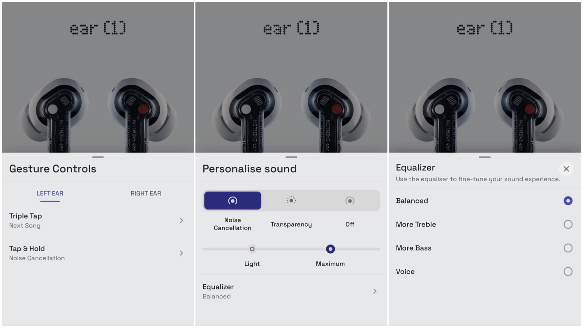 The Nothing app will let you change out some of the features — you can change a triple tap to next song or previous song, and tap and hold to noise cancellation or nothing — but the assortment of choices isn’t large.