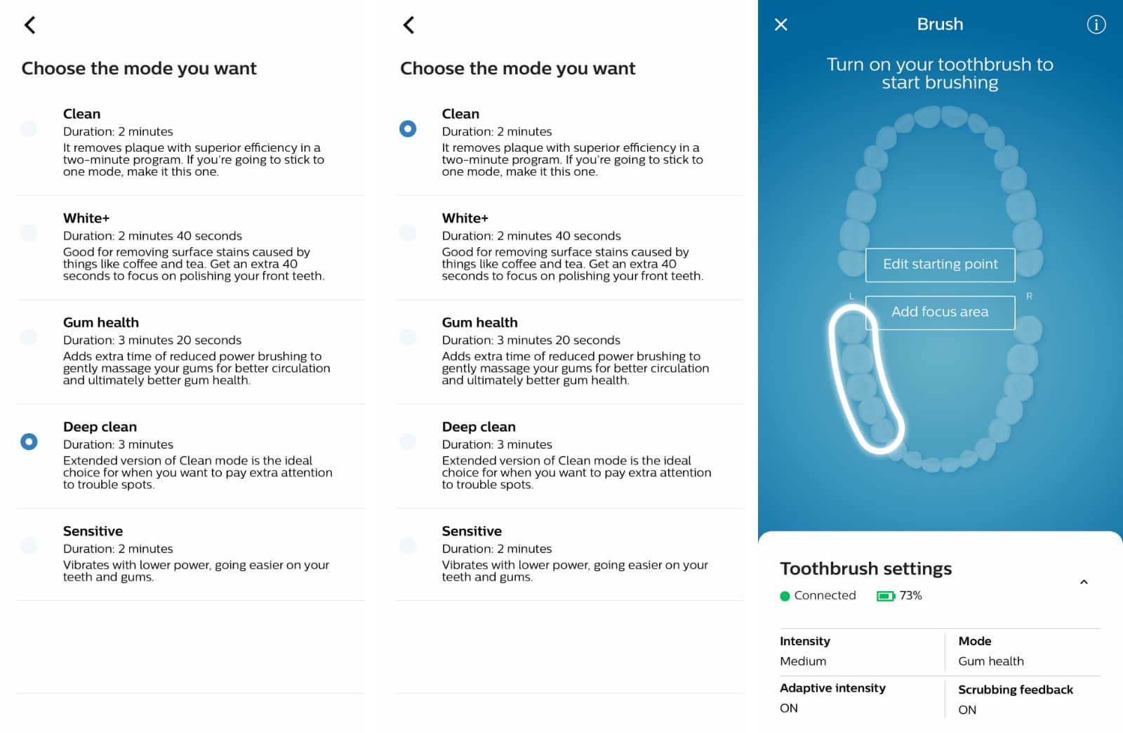 Rather than jump between “deep clean” and “gum health” simply by pressing a button on the handle, you need to go through the app, which we’re not sure is a step that is helpful.