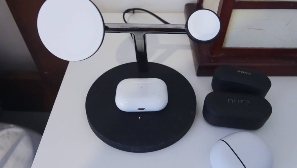 We ran quite a few on the pad, and found Sony’s WF-1000XM4 earphones worked, as did our pre-production unit of the upcoming NuraTrue Pro. A pair we’re reviewing right now, the Google Pixel Buds Pro also worked to charge on the Boost Charge Pro 3-in-1, but the Sennheiser Momentum True Wireless 3 did not, with the orange light on the Belkin stand telling us that something was wrong.