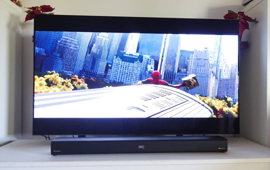 Testing the BlueAnt XT100 with Dolby Atmos in Spiderman: No Way Home the sound was bright with a smattering of bass, the latter of which we found we could control simply by pressing a simple set of controls. Dialogue was clear, but the sound wasn’t as full as we’d like. You’ll find some sense of surround in movies, but like other virtual Atmos versions, it’s really only there when your head is aimed at the TV’s direction, and lacks the complete sound of a proper 3D sound system.