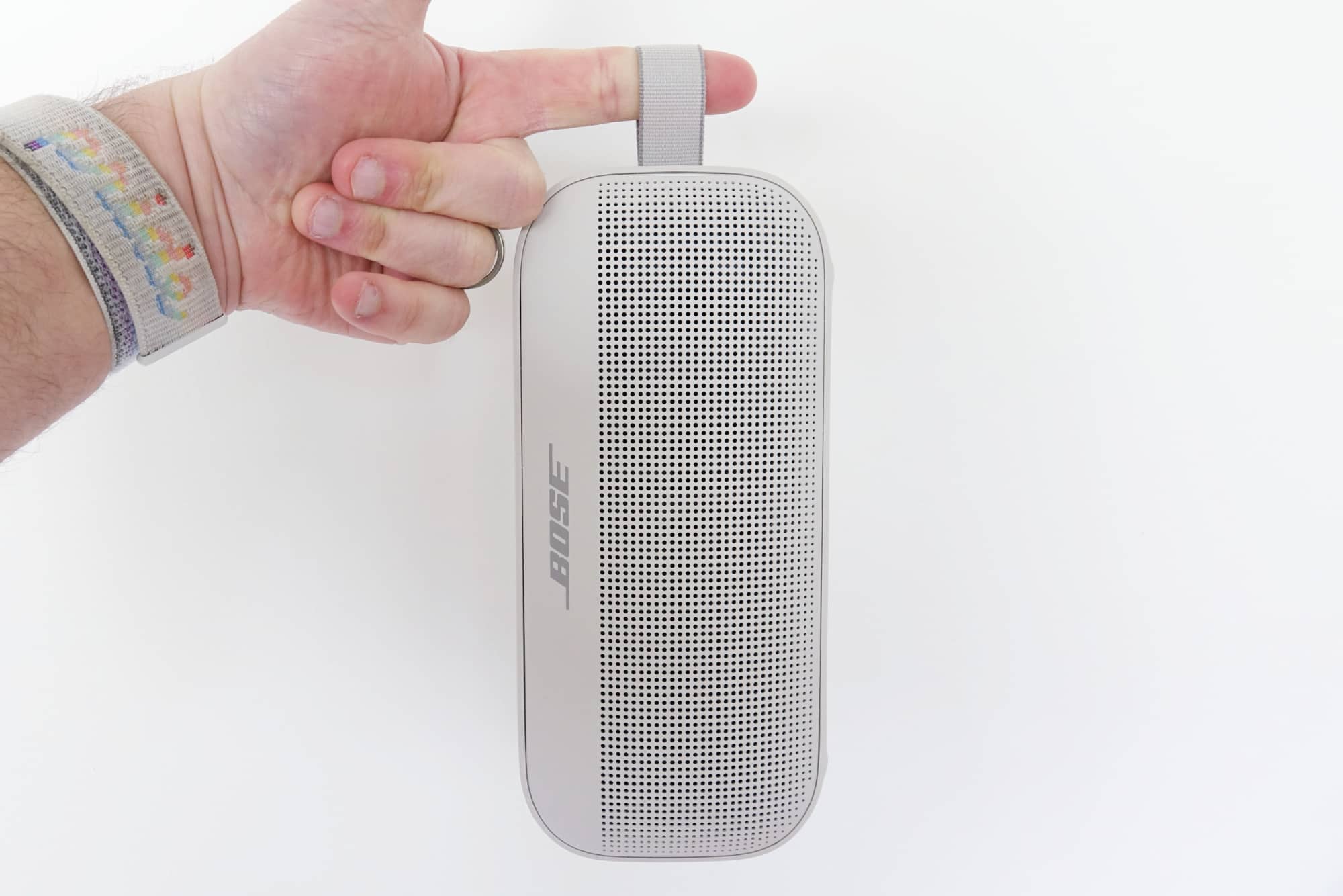 One of the more useful additions, however, is a fabric loop built into the side or top, depending on how you look at it. With this simple addition, you can clip the SoundLink Flex to a carabiner and bring the speaker with you anywhere, or just loop your finger in and hold it that way, too.