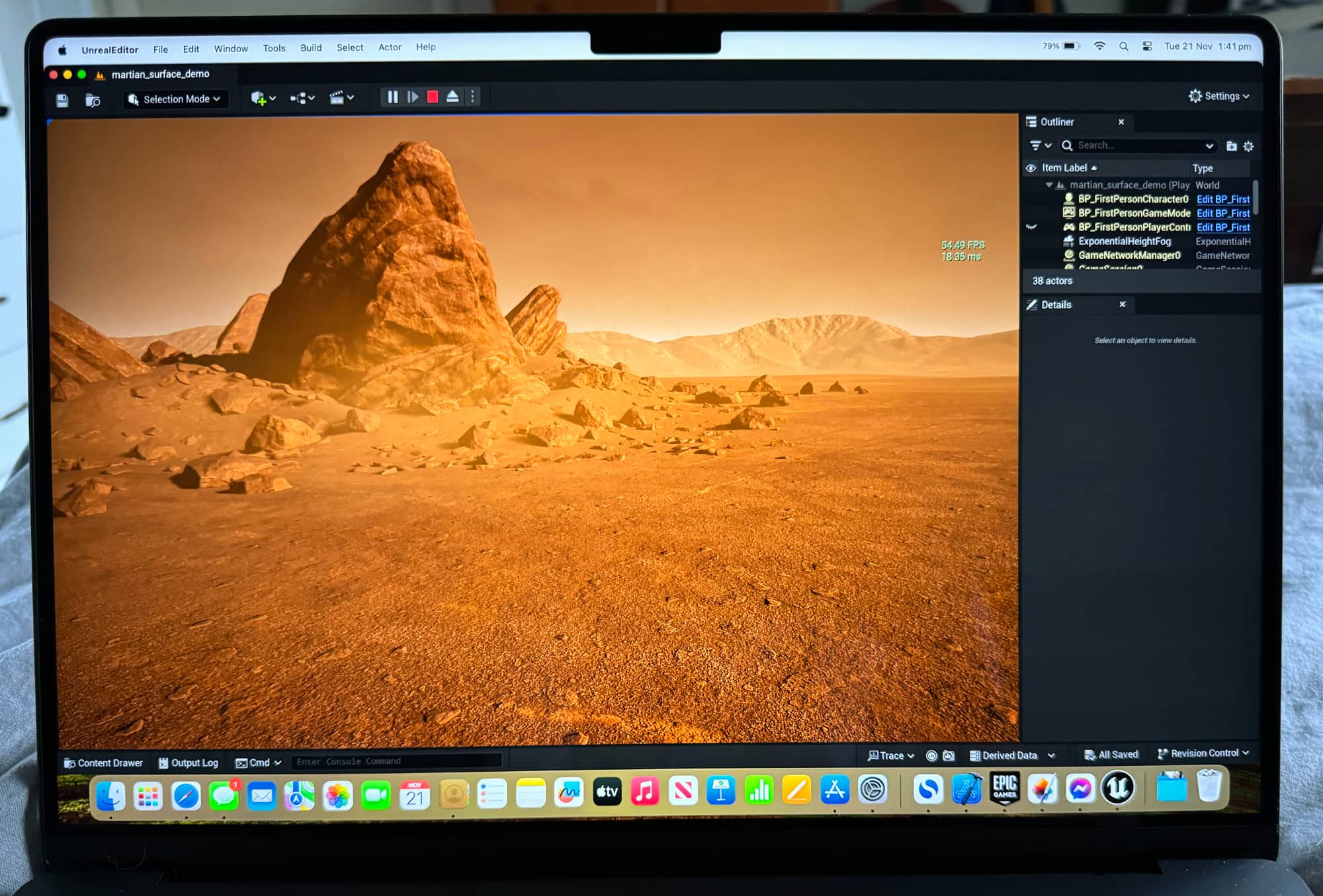 Your mileage may vary, of course, because projects aren’t always the same especially for different needs, but our simulation of the environment of Mars we were building loaded better on the M3 Max MacBook Pro than any other machine we’ve tested prior, and it was about enough to make us fall in love. While one VR file didn’t want to load (and we suspect it might have been our error), all others were fine, and we were able to explore our Mars-scape at 35 to 53fps without any issues whatsoever.