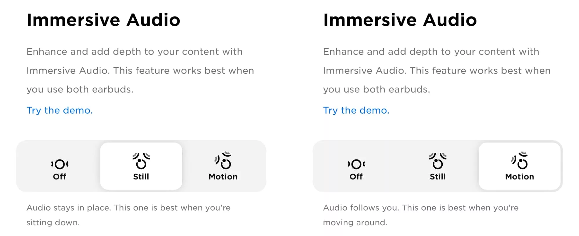 Spatial comes in two flavours for the Bose Buds Ultra, with the “Still” mode tracking your head’s position as it travels between left and right similar to how it works via Apple, while “Motion” mode essentially tracks both head and body position, something Bose says is better if you’re moving. It’s not called “spatial” either, but rather “immersive”, which basically means the same thing.