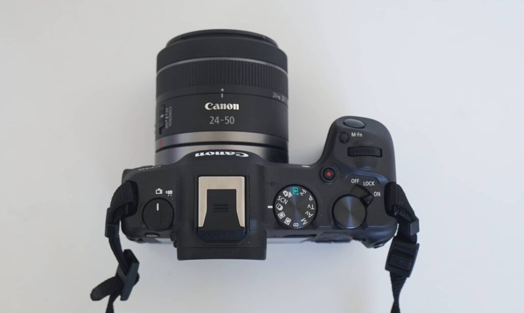 Look down at the top of the EOS R8 and you’ll find a switch on the left to jump between stills and video, a dial on the right to toggle modes, plus an easy to use switch for on, off, or locking the camera settings, plus a few other wheels and buttons for the enthusiasts and pros.
