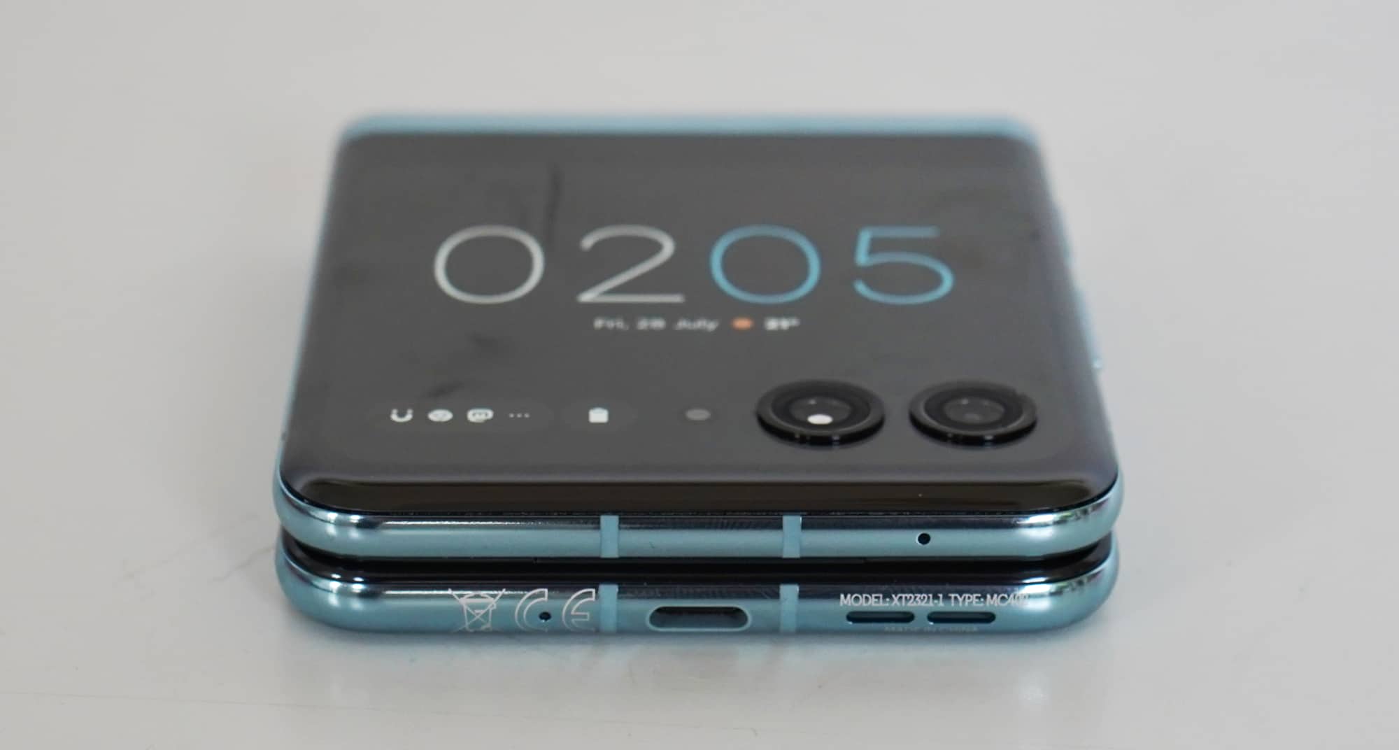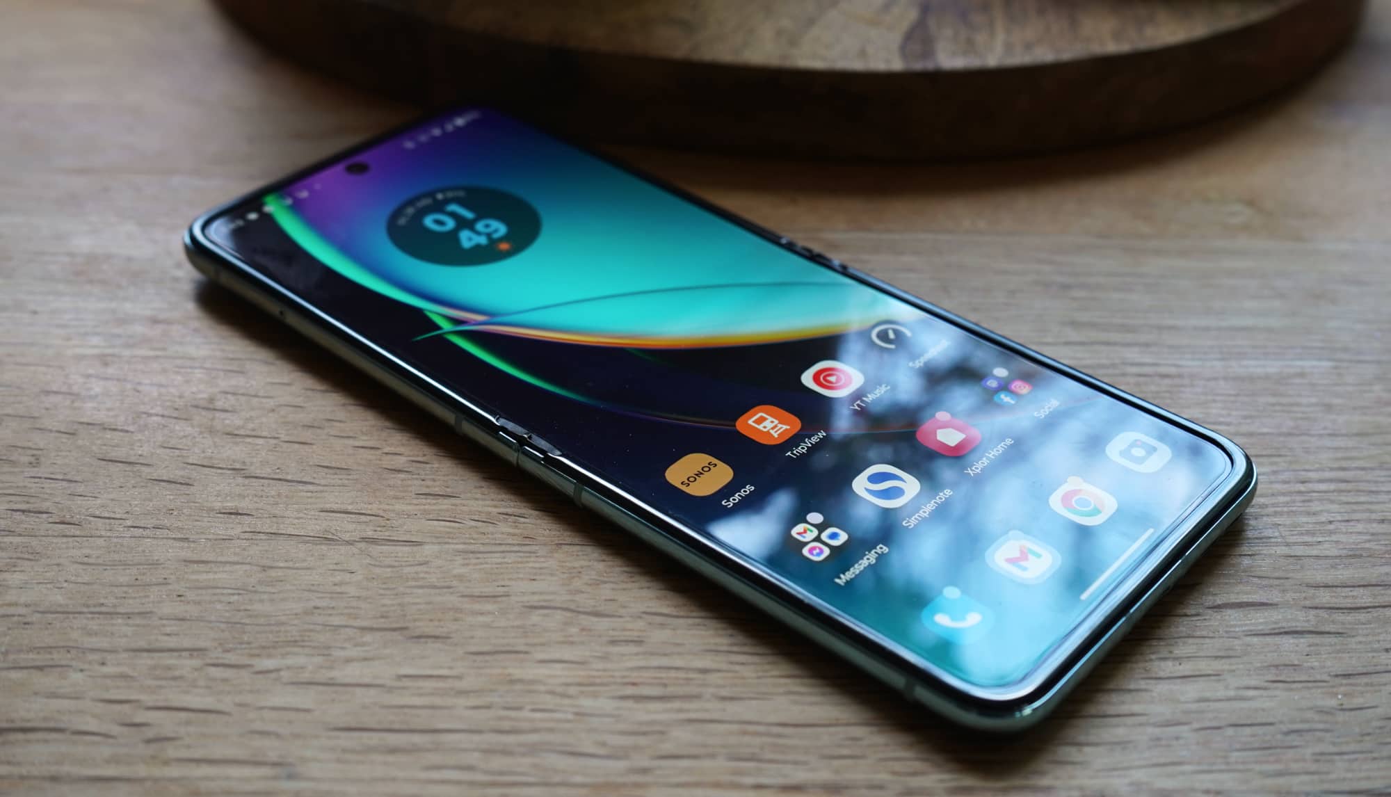 Probably our favourite foldable phone design of the two major types that have popped up, the Razr 40 Ultra keeps the hinge on the size holding two phone sections when closed, while opened sees the two halves not quite laying flat and tilting up slightly.