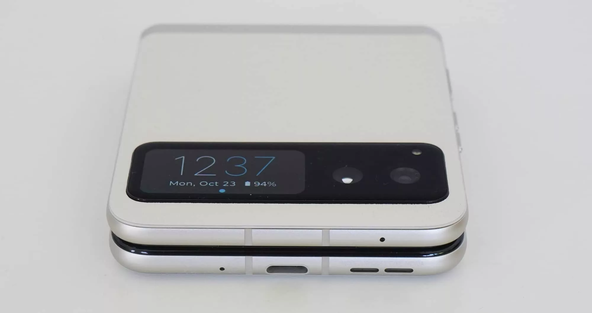 There’s a small 1.5 inch OLED screen for notifications and such on the outside that you can swipe to play with, plus a bigger 6.9 inch pOLED screen on the inside revealing Android 13 and all it has to work with.