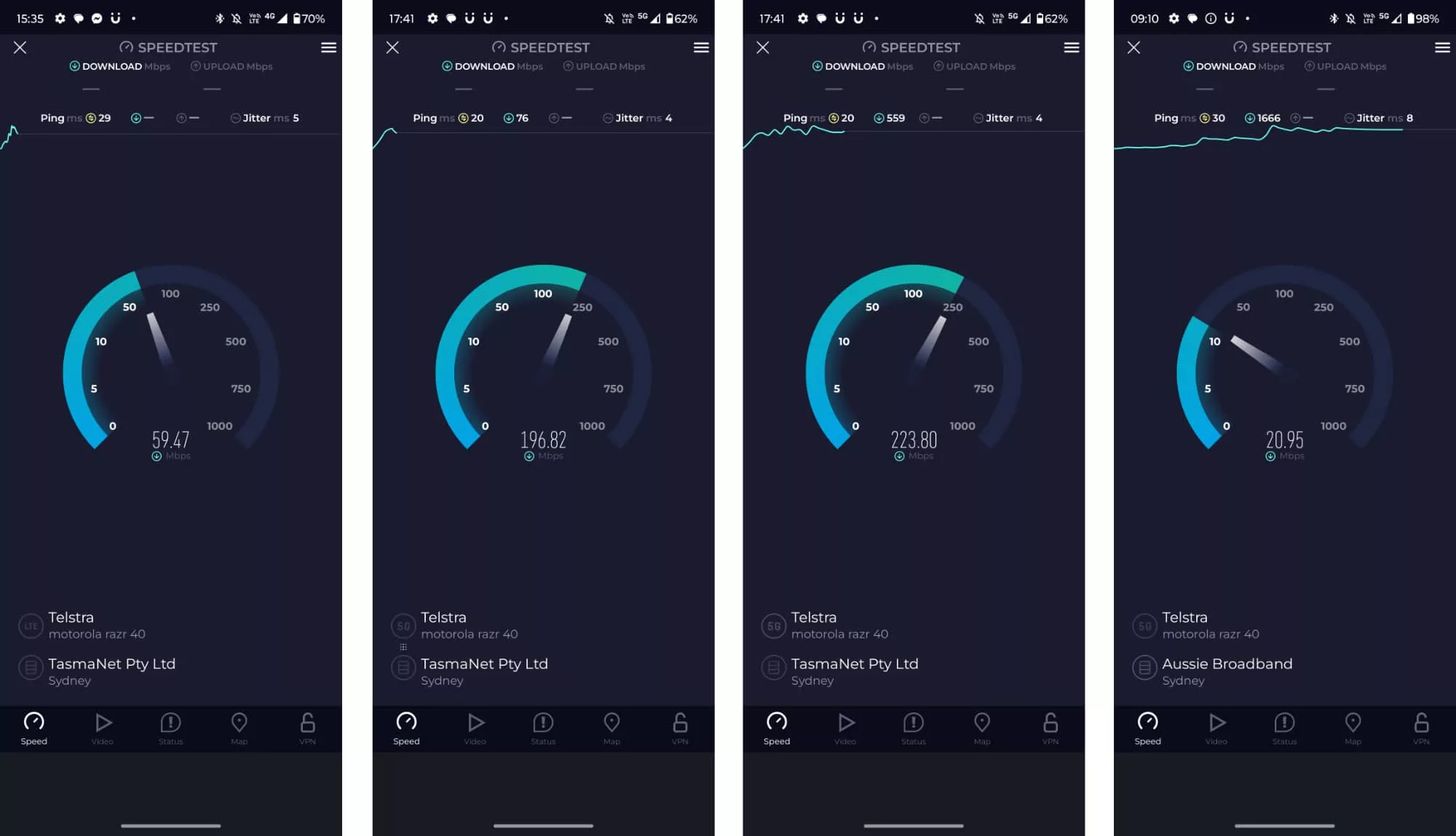 Testing the Razr 40 on the Telstra network in Sydney by way of Mate, we found speeds as high as 297 before Mate’s speed limiter kicked in. Telcos and speeds vary, but that’s a great outcome for a phone these days.