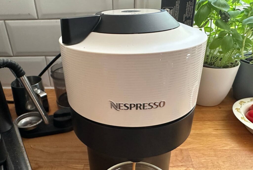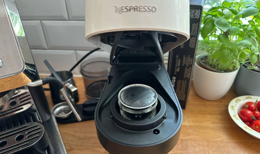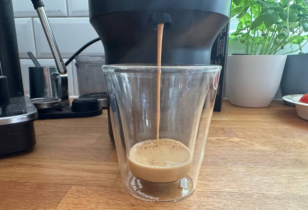 With a coffee cup underneath the spout at the front, or a short espresso glass, you’ll get coffee out of the Vertuo Pop, or at least something resembling it.