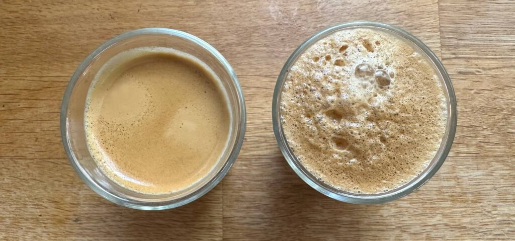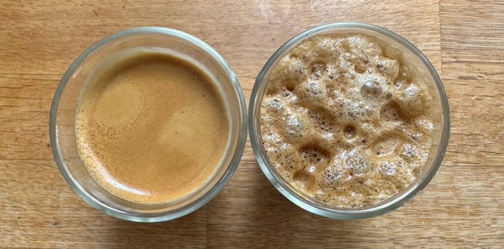 One of these is clearly not the other. While the crema in a proper espresso is still there minutes after making (left), the foam on the Vertuo is breaking down (right).