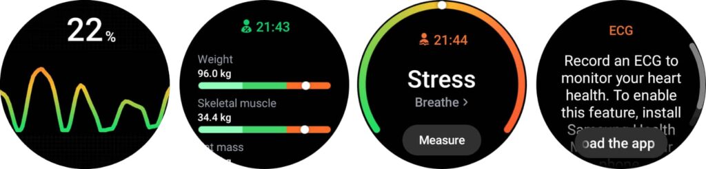 It’s a similar situation with the ECG, which wouldn’t fire. We could record blood pressure manually, and SpO2 blood oxygen measurement would trigger via the stress measurement or while sleeping, but without a Samsung phone, we couldn’t seem to fire these up, which was a real shame.