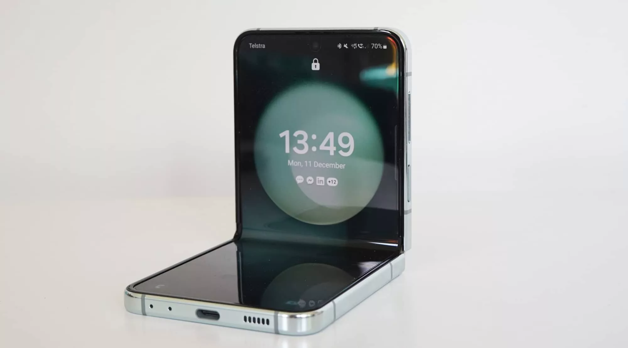 Where the Flip 5 differs is the front screen, which is no longer a small blip on the front, but mostly a full display. There’s a little shelf cut out, but by and large, you get an extra display that gives you most of the front of the phone to work with, much like the extra screen on the front of the Fold 5.