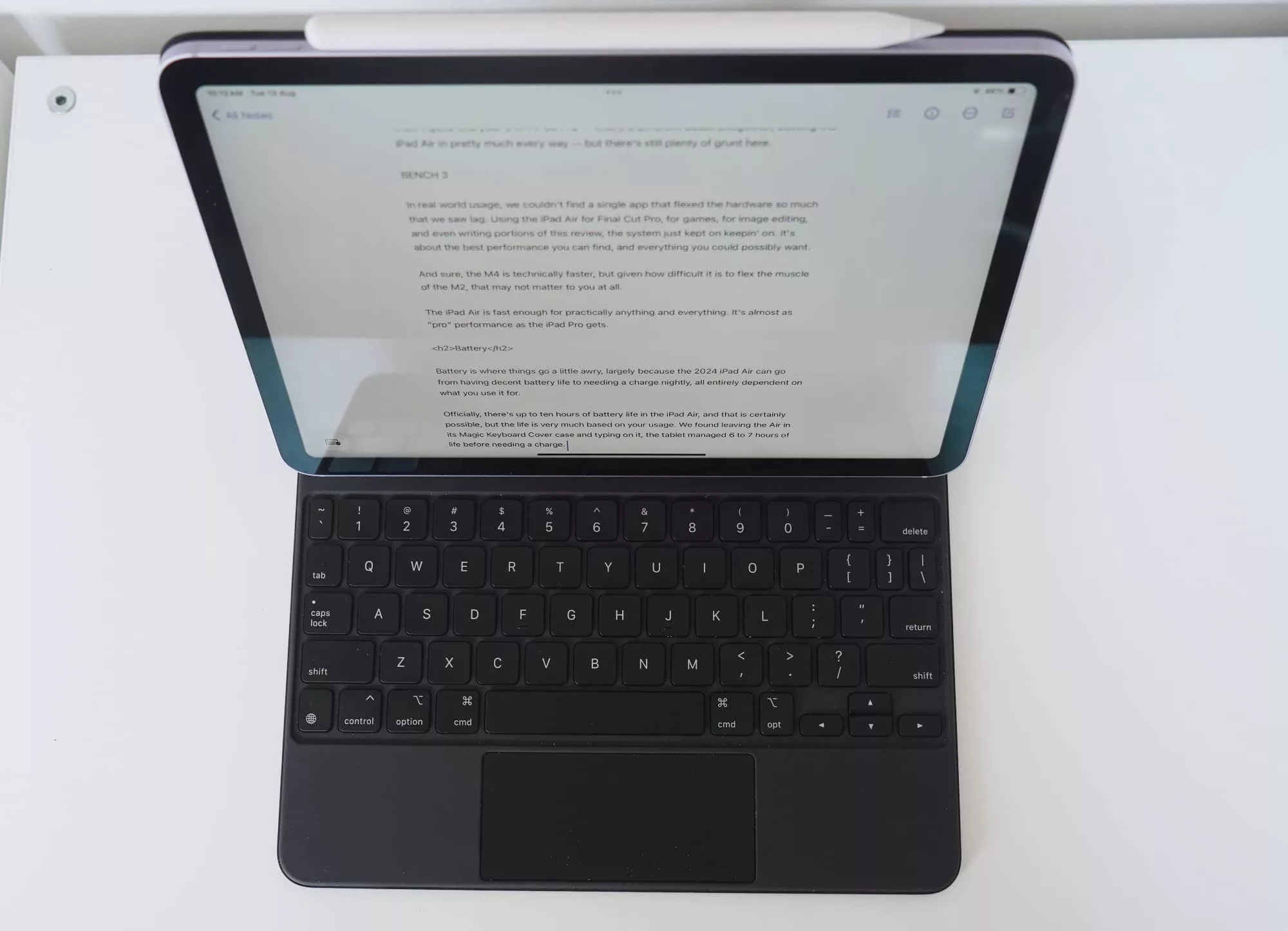 Officially, there’s up to ten hours of battery life in the iPad Air, and that is certainly possible, but the life is very much based on your usage. We found leaving the Air in its Magic Keyboard Cover case and typing on it, the tablet managed 6 to 7 hours of life before needing a charge.