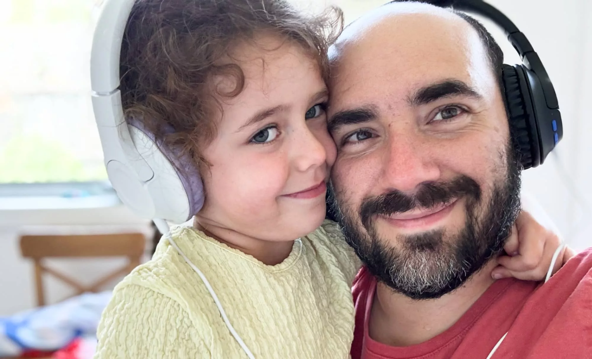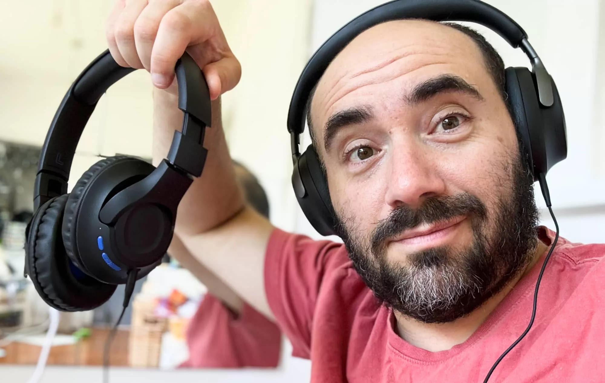 It could have been any pair, truth be told, but we just went with the pair within arm’s reach. Again, voila, it worked: three pairs of headphones set up in a daisy chain of sound.