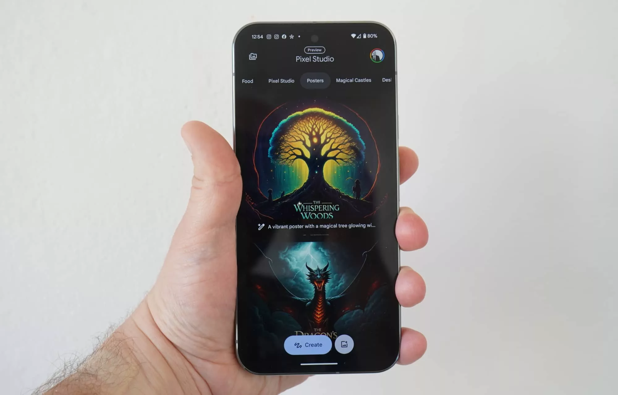 There’s another built-in AI image generator called “Pixel Studio” rather like your very own compact Midjourney image maker, albeit with human limitations. Type in your prompt, pick the style, and get out some AI art worthy of being shared.