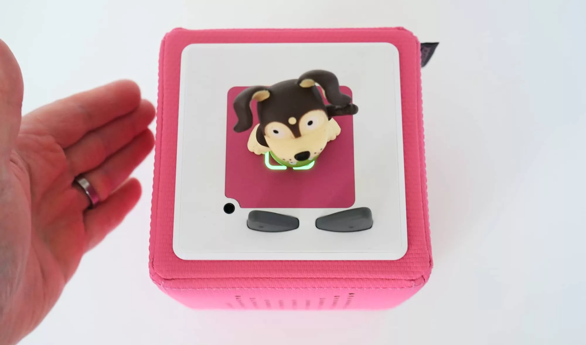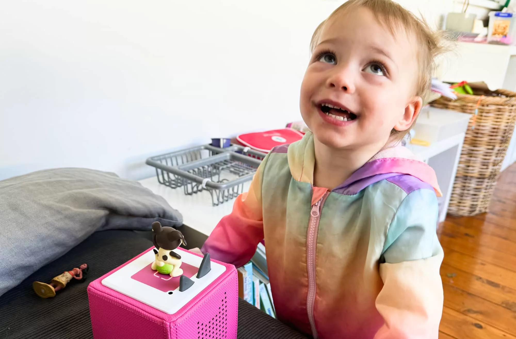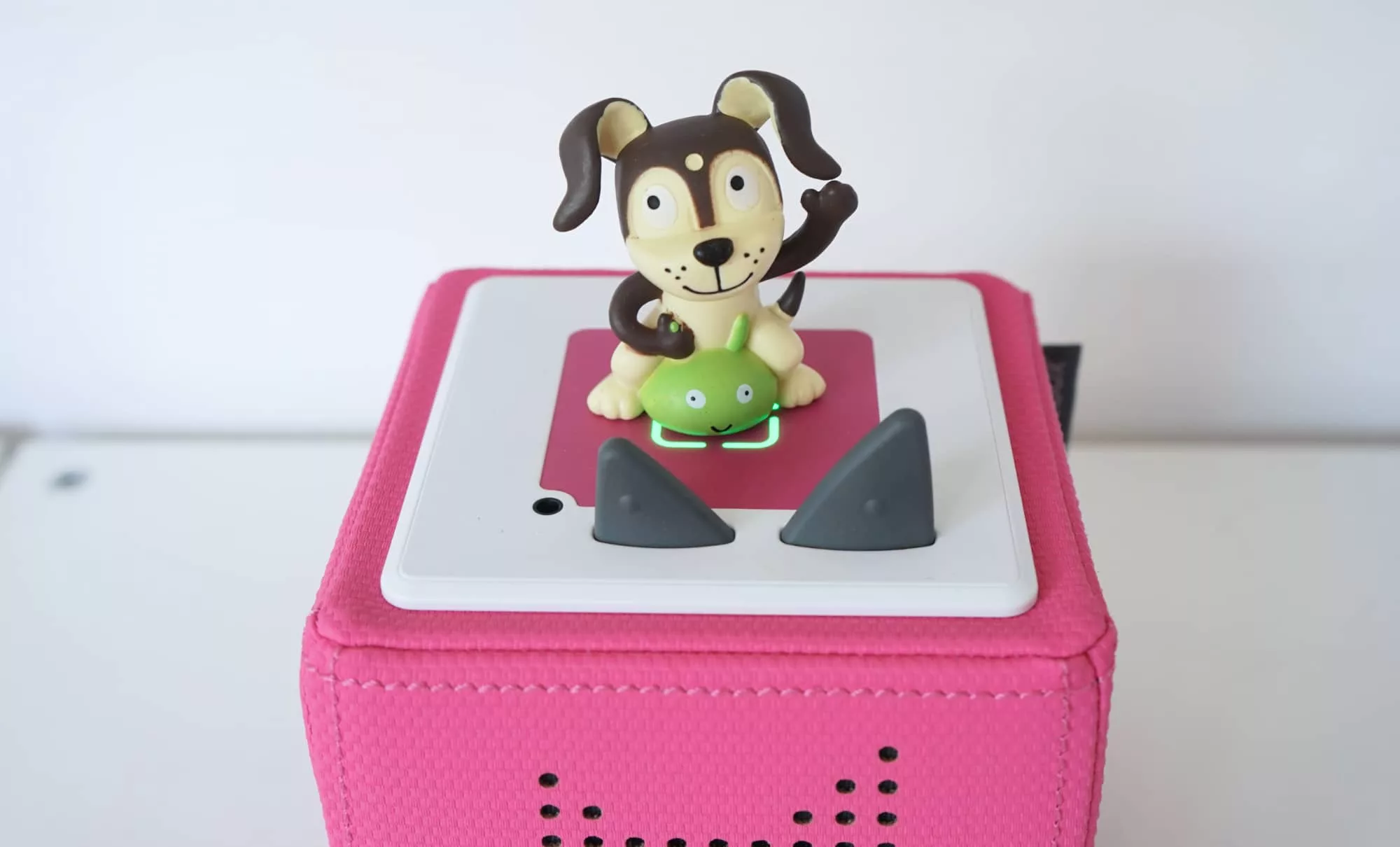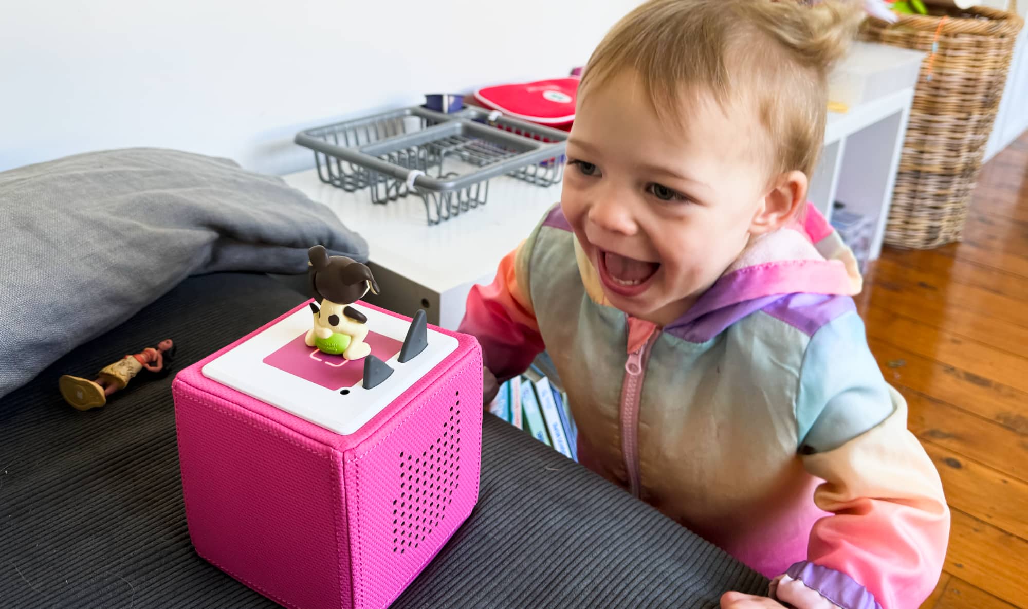 Take Ms 2, who loved walking around with the little puppy figurine that came inside the box, and wanted nothing more than to bash the sides of the Toniebox seemingly on repeat to get it playing “1, 2, 3, 4, 5, once I caught a fish alive” on repeat.