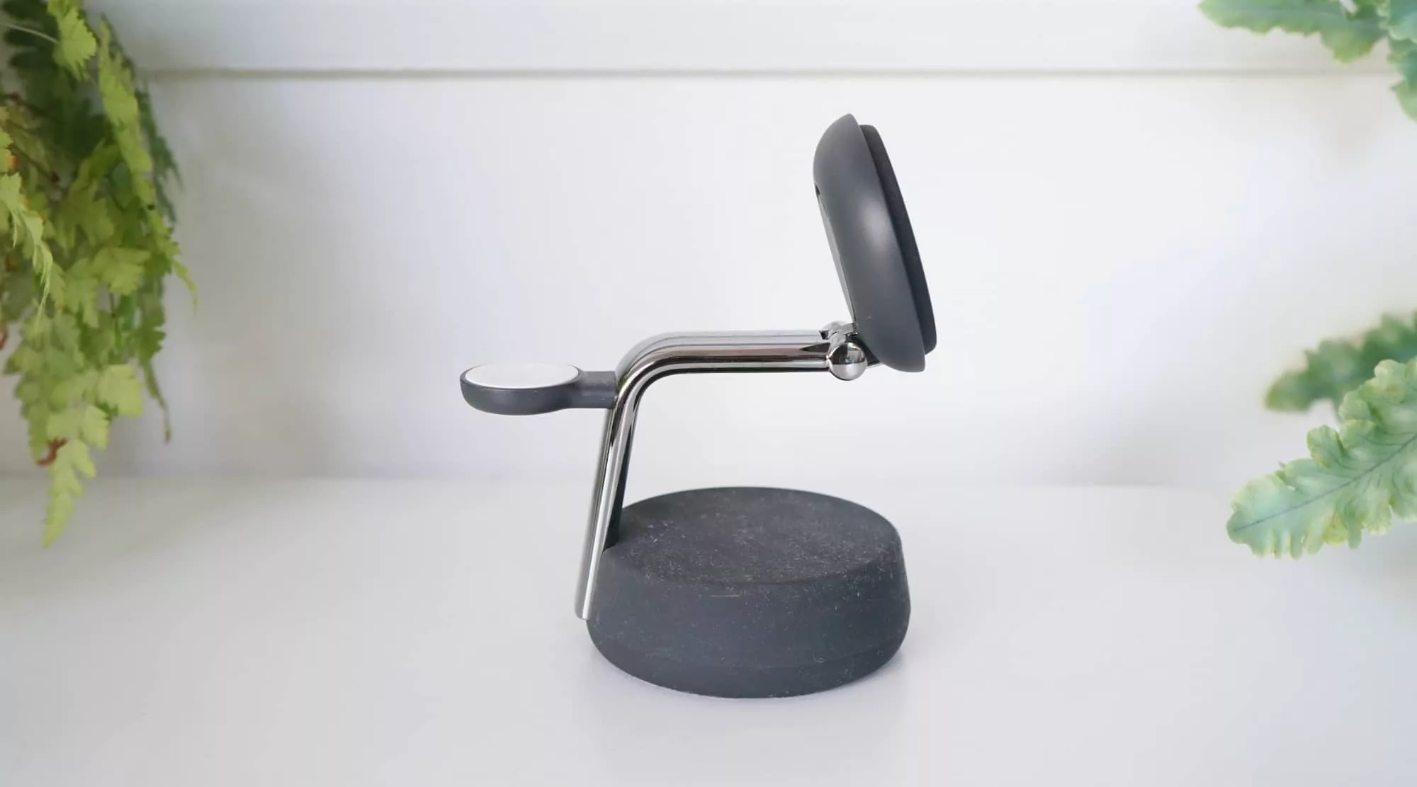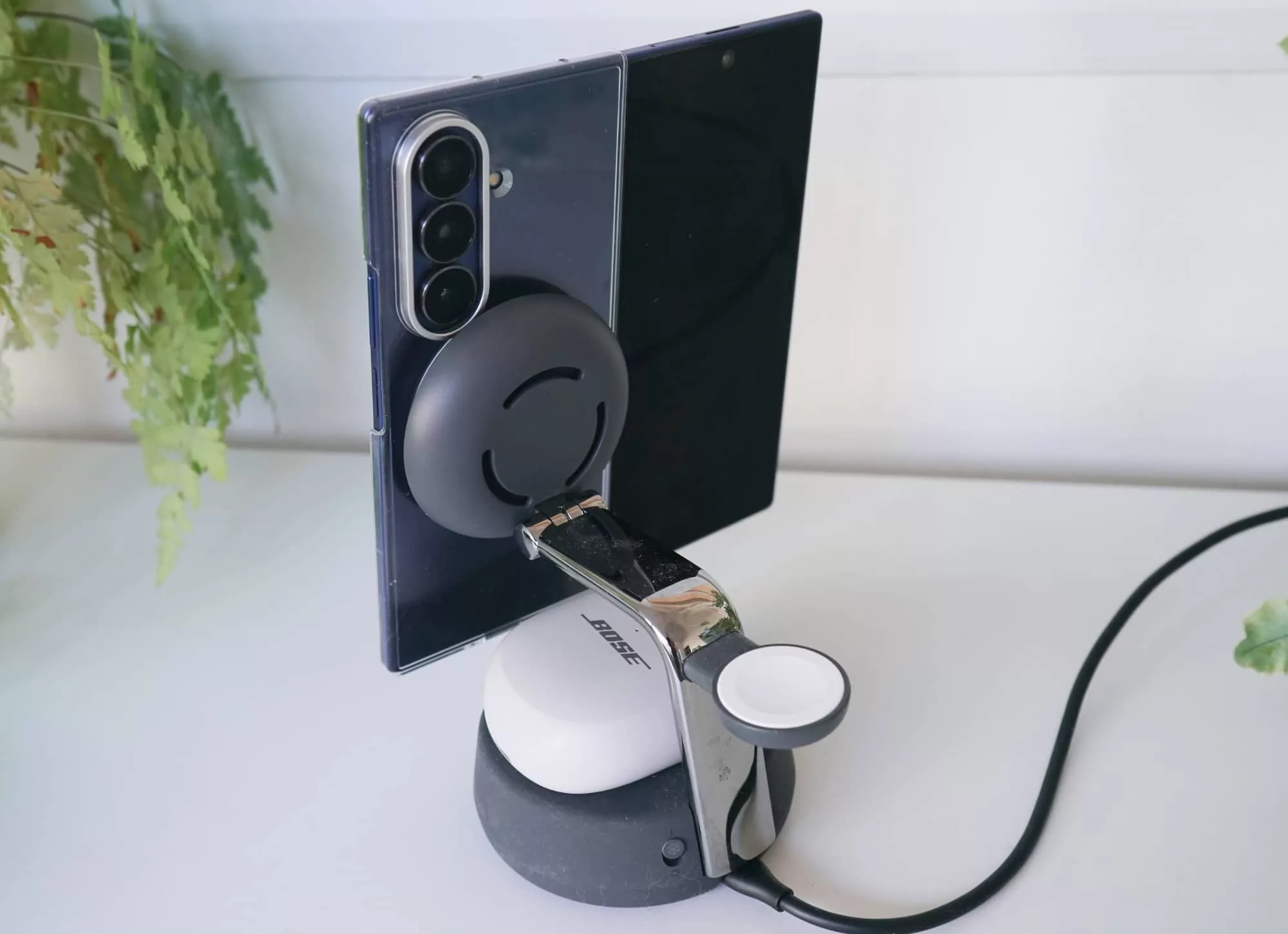 You simply attach your phone using the magnetic pad, rest your Apple Watch on the charger, and leave your wirelessly rechargeable earphone case on the base beneath it all.