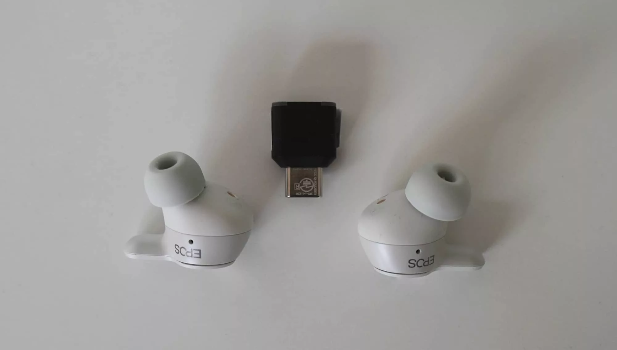 Four tip sizes are included in the non-descript brown box, as is the rechargeable case holding the E1 earbuds and the USB-C key with a built-in receiver.