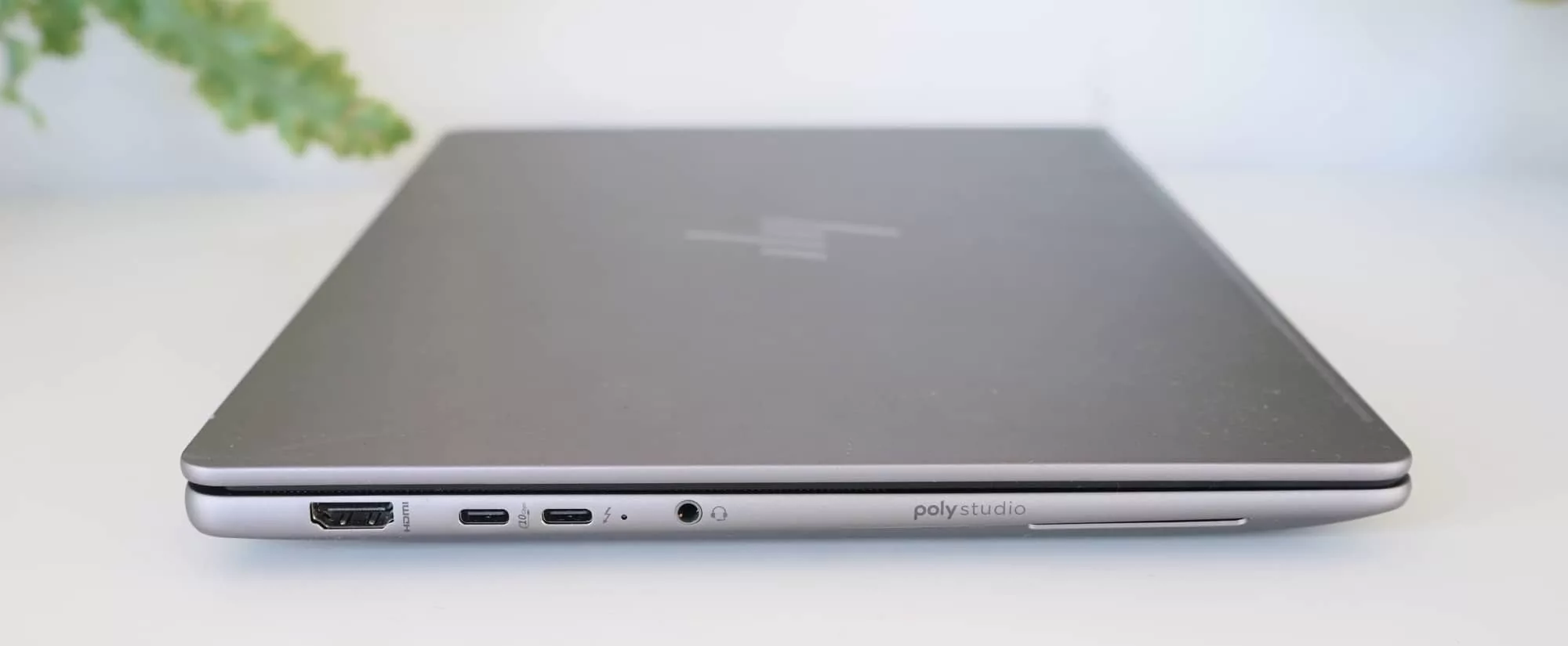 The side even gives you an idea of the sort of multimedia prowess HP has thrown in, complete with the words “PolyStudio” on the side. That’s a nod to the camera and mics inside, leveraging the Poly brand (once Plantronics) for four speakers and two microphones.